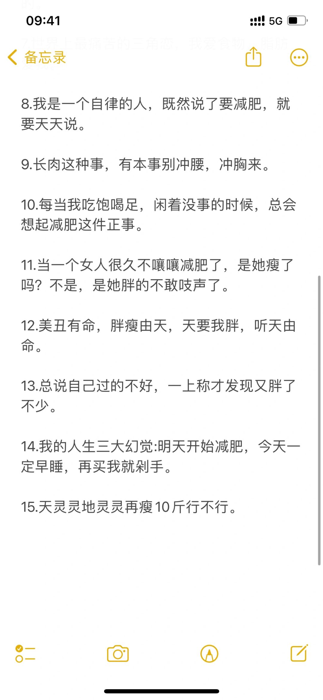 1.减了两天肥,瘦没瘦不知道,反正活的太没意思了,现在这状态,上街都能啃两个人。 2.别指望减肥了,猪八戒都走了十万八千里都没瘦,跟何况他还是吃素的。 3.减肥真的太暴躁了,吃少了想揍人,吃多了想揍自己。 4.减肥这个事儿吧,减一斤跟玩命似的,长一斤跟玩儿似的。 5.我在减肥的路上,已经迷路了N次,现在连地图都嫌弃我了。 6.体重可不可以搞点活动,满100减20之类的。 7.世界上最痛苦的三角恋,我爱食物,脂肪爱我。 8.我是一个自律的人,既然说了要减肥,就要天天说。