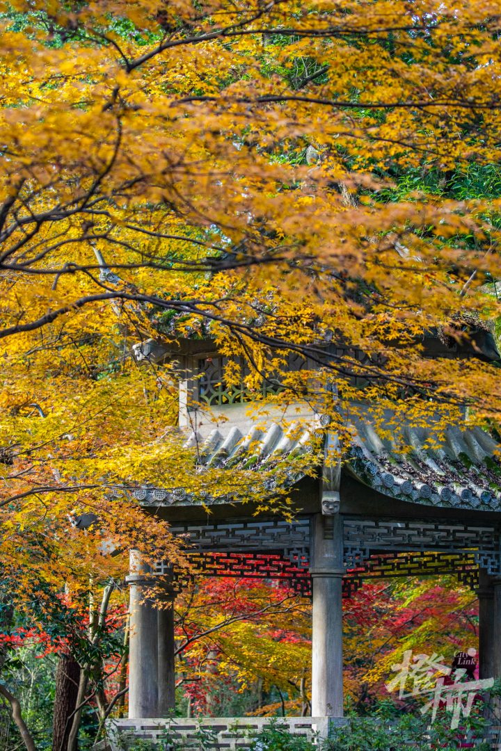 “九里云松十里枫,林下片片映山红”说的就是灵隐路上的景致——从洪春桥一路往西南,深深浅浅的金黄、或浓或淡的嫣红,这里的鸡爪槭和红枫眼下已经进入颜值巅峰期,怎么拍都好看。