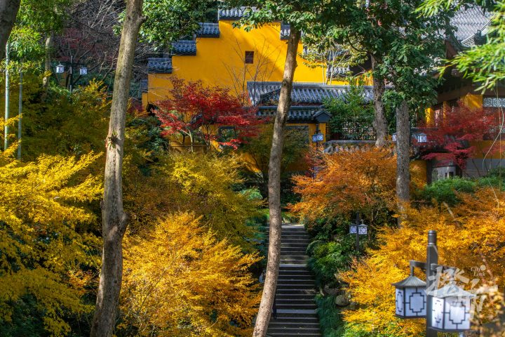依山而建的永福寺里,一路都是鸡爪槭和红枫。没有固定的赏枫线路,五彩缤纷,三五成丛的鸡爪槭点缀穿插在整座寺院中,多了几分禅意的红叶,更有“枫”韵。