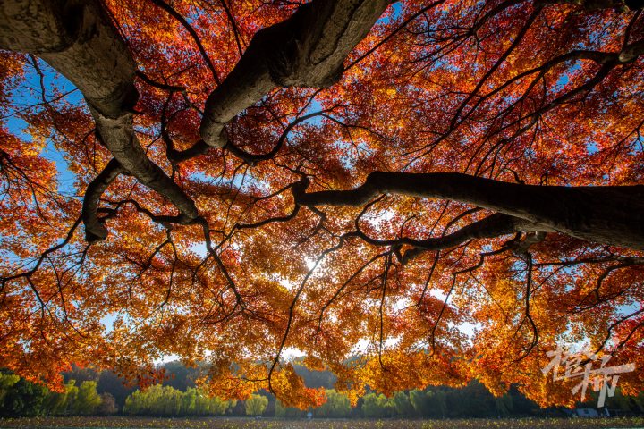在橙友圈,很多橙友推荐虎跑公园内的一株“枫树王”,也是年年美出新高度。最近这里又围满了杭城摄影爱好者,它的位置就在“虎跑梦泉”碑亭附近,标志性的大茶壶雕塑旁边,站到树下,枝干向四周舒展,像一柄巨大的红叶伞。