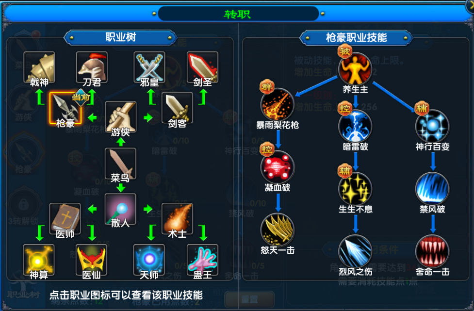 枪豪:定位坦克,优先点满养生主(提升生命值)、禁风破(概率虚弱控场)和凝血破(概率减速),烈风之伤、舍命一击各加5点,挂机用暴雨梨花枪清群怪,副本中靠挑战之心嘲讽拉仇恨。属性优先加体质堆生命值,再少量加力量补输出。
