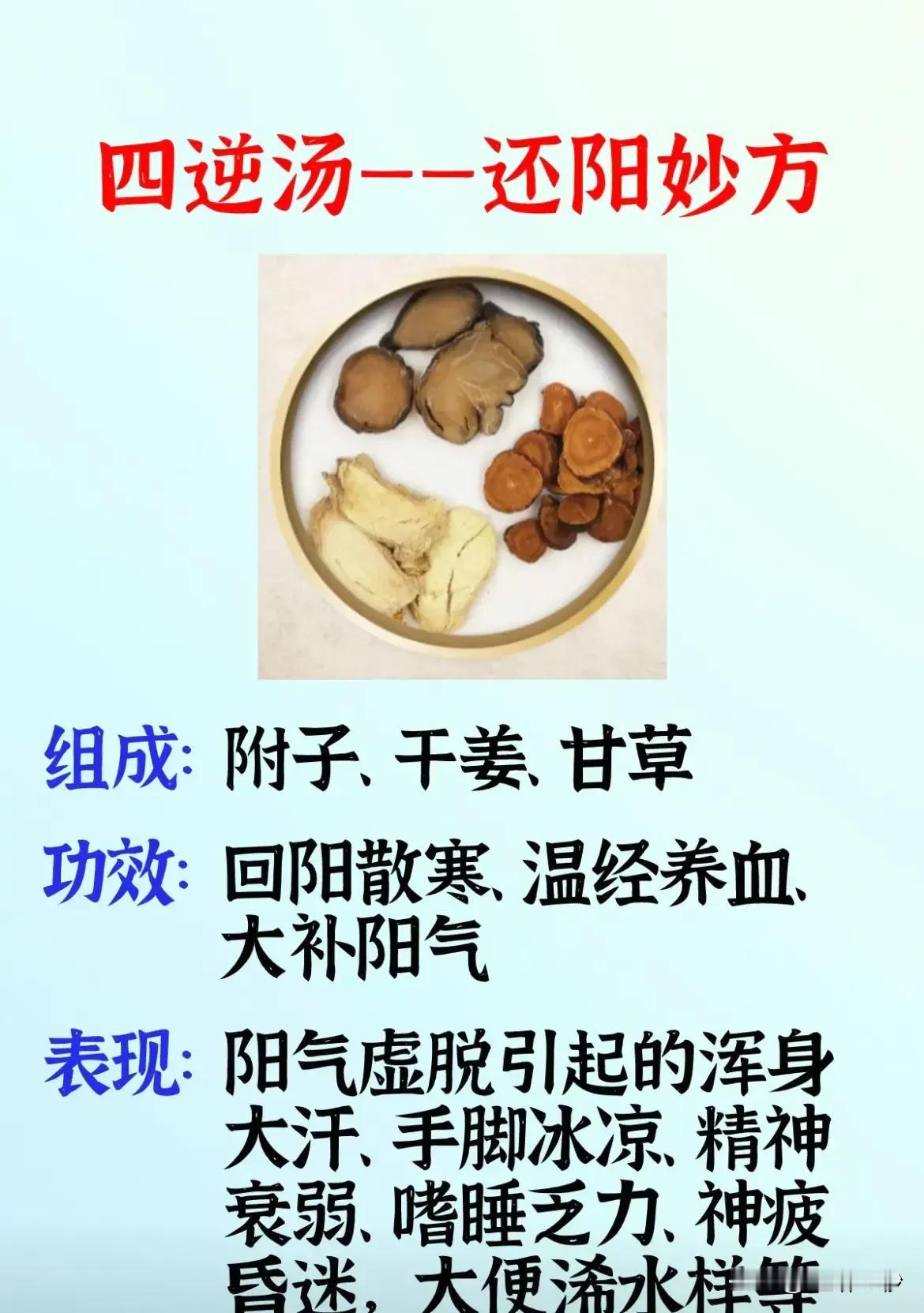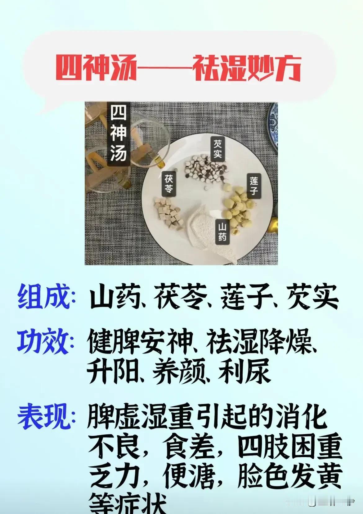 养身之道,四个千古方的重要性你了解吗? 众所周知,健康是人生的第一财富。而在养身之道中,自古流传下来的四个千古方——四君子汤、四逆汤、四神汤和四物汤,它们各具特色,对于调理身体有着不可忽视的作用。今天,我们就来详细了解一下这四个千古方。 首先,我们来说说四君子汤。四君子汤被誉为补气妙方,它的主要成分包括白术、党参、茯苓和甘草。这款汤饮具有补气行水、益气健脾的功效,特别适合脾胃气虚的人群,如出现面色苍白、精神萎靡、声音低沉、气短乏力、食少便溏等症状。 接下来是四逆汤,它被誉为还阳妙方。此方由附子、干姜和甘草组成,具有回阳散寒、温经养血、大补阳气的功效。在阳气虚脱的情况下,如浑身大汗、手脚冰凉、精神衰弱、嗜睡乏力、神疲昏迷,以及大便浠水样等症状,四逆汤无疑是一道救急良方。 再来说说四神汤,它被誉为祛湿妙方。此方由山药、茯苓、莲子和芡实组成,具有健脾安神、祛湿降燥、升阳、养颜、利尿的功效,特别适合脾虚湿重的人群,如出现消化不良、食差、四肢困重乏力、便溏、脸色发黄等症状。 最后是四物汤,它被誉为养血妙方。这款汤饮对于血虚问题有很好的调理作用,如出现心慌失眠、头晕目眩、神疲乏力等症状,以及女性月经不调、经期疼痛等问题,四物汤都能发挥出显著的疗效。 这四个千古方,看似简单,实则蕴含了古人智慧的结晶。然而,我们也要注意,每个人的体质和症状都不同,因此在应用这些千古方时,一定要在专业医师或营养师的指导下进行,可千万别用错了! 综上所述,这四个千古方在调理身体方面具有重要的作用。无论是气虚、阳虚、湿气重还是血虚,都有相应的千古方可以应对。但我们要明确一点,健康的生活方式离不开良好的饮食习惯、适当的运动和充足的休息。只有在全面均衡的条件下,我们才能真正享受到健康带来的美好生活。 最后,希望每一位读者都能从中受益,让这四个千古方为你的健康保驾护航!#你相信中医吗# #清风计划# #健康科普# #中医你知多少#