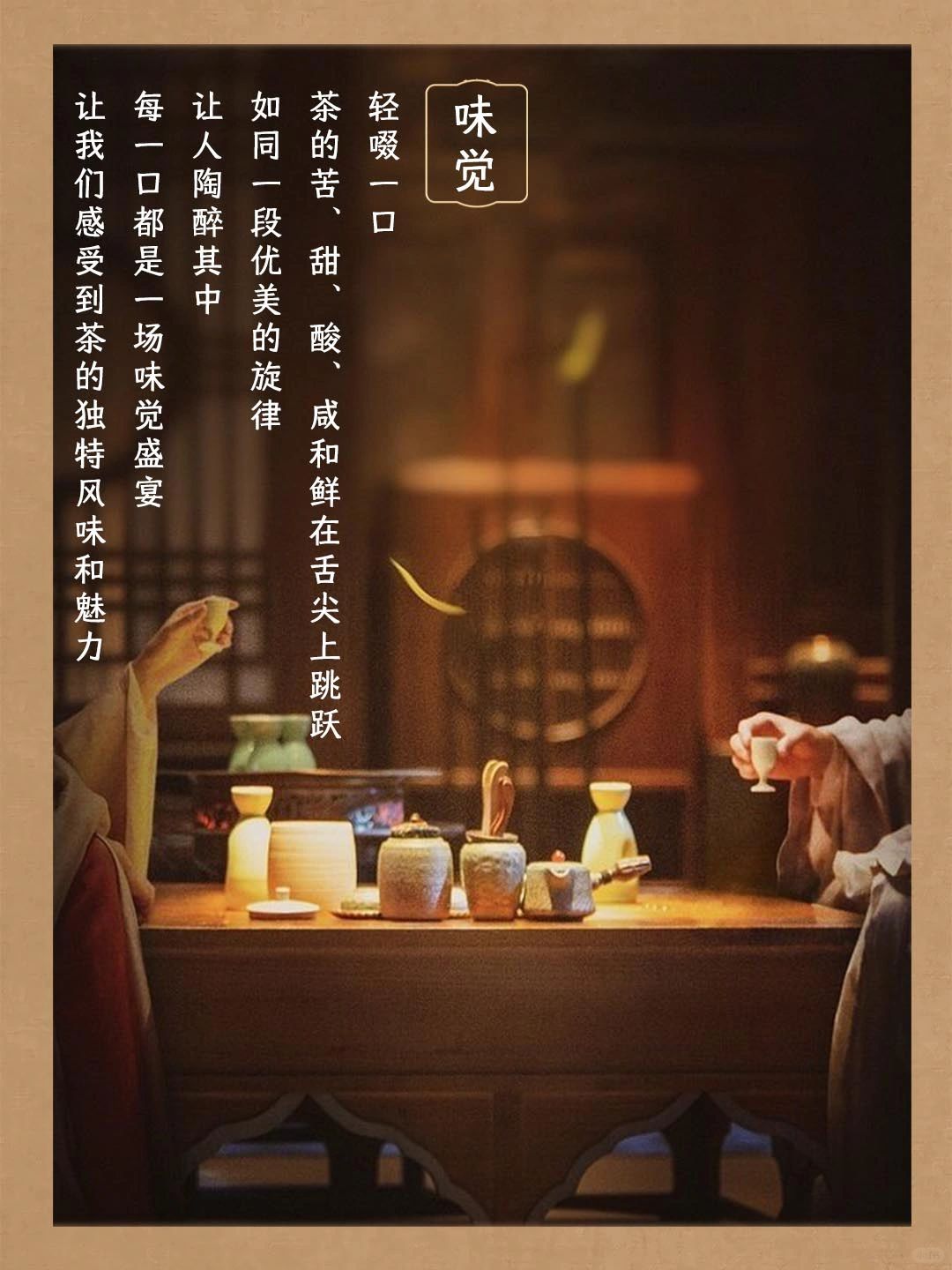 👄味觉:轻啜一口,茶的苦、甜、酸、咸和鲜在舌尖上跳跃,如同一段优美的旋律,让人陶醉其中。每一口都是一场味觉盛宴,让我们感受到茶的独特风味和魅力。