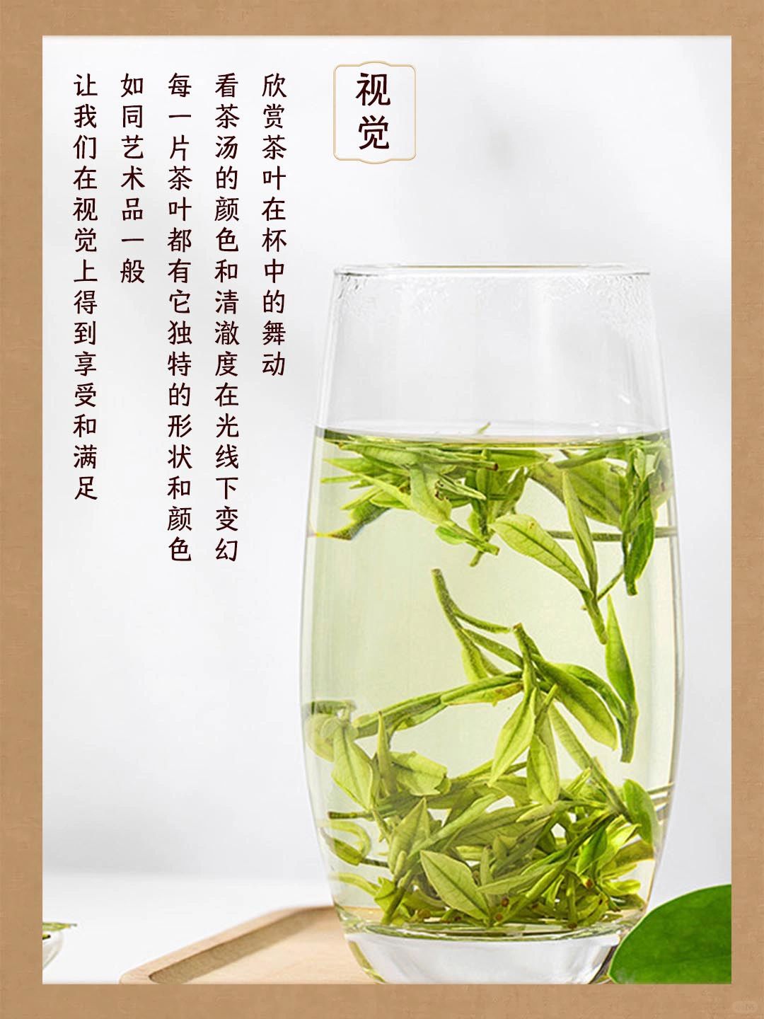 👓视觉:欣赏茶叶在杯中的舞动,看茶汤的颜色和清澈度在光线下变幻。每一片茶叶都有它独特的形状和颜色,如同艺术品一般,让我们在视觉上得到享受和满足。
