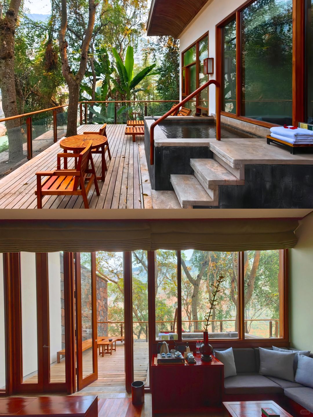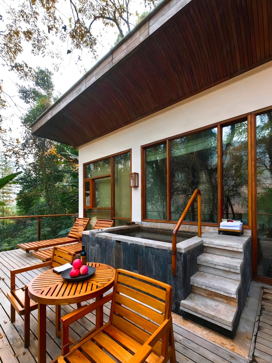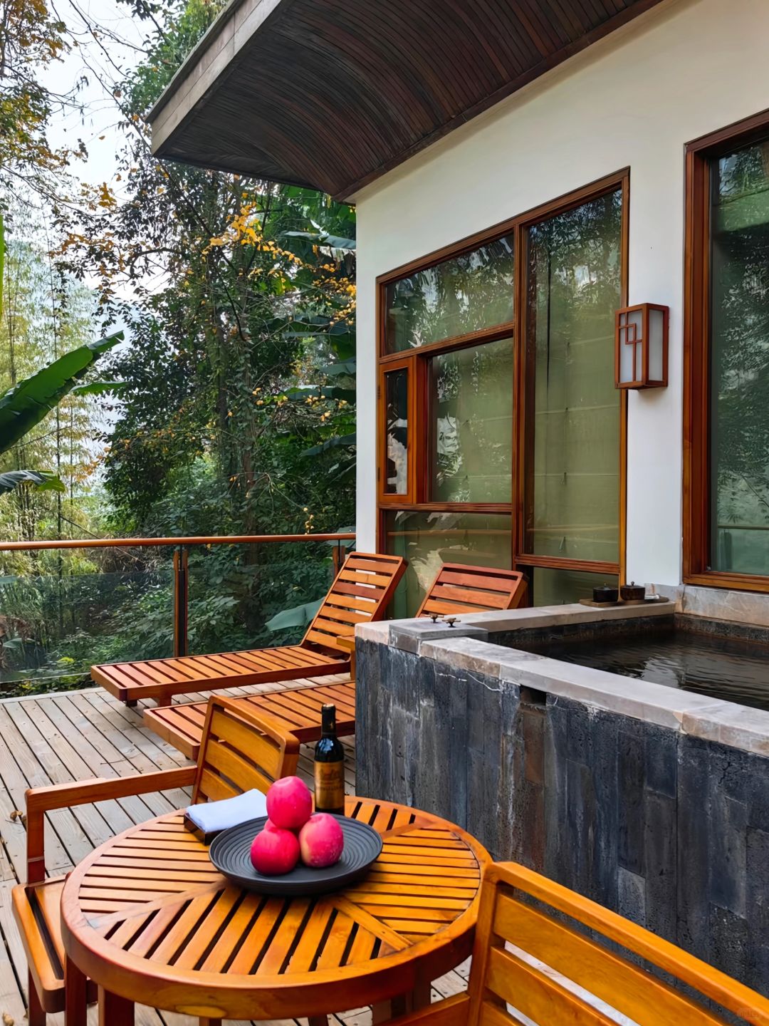 ✔️柏联入门的房型其实就已经很大了,达到了70平,但是很遗憾没有住过,因为我唯一一次预定江景精选客房,升级到了上一级江景经典汤屋,区别在于大10平米,其实两个房型差别不大。柏联的装修是我见过少数把中式酒店装的非常舒服的,内外大面积使用木材包裹搭配白色外墙十分高级。值得一提的是酒店每一处都针对原有的树木进行了独特设计。为了让原有树木保留打了很多的洞,却一点也不违和,反而和酒店融为一体。房间内的床正对嘉陵江,电视藏在床尾,需要的时候可以升起来,最重要的支持投屏!露台临崖而建视野超级绝,入户温泉是大名鼎鼎的北温泉水二次加热入户非常舒适,还会提供免费的玫瑰花瓣。备品是全套Le labo,minibar全免费,有全套的茶具加上柏联自产的普洱。有意思的是柏联的欢迎礼物统一是五个红色的苹果。