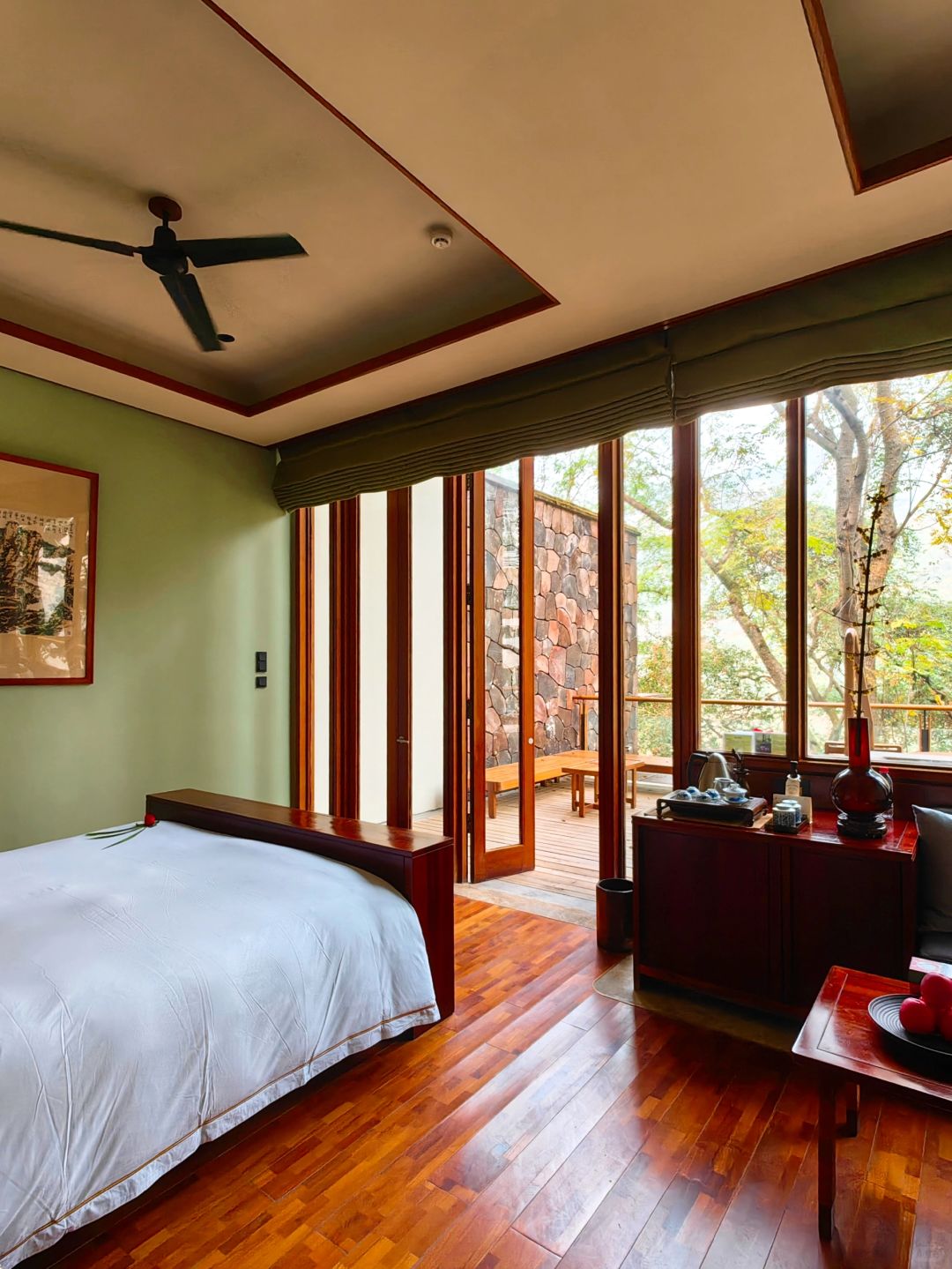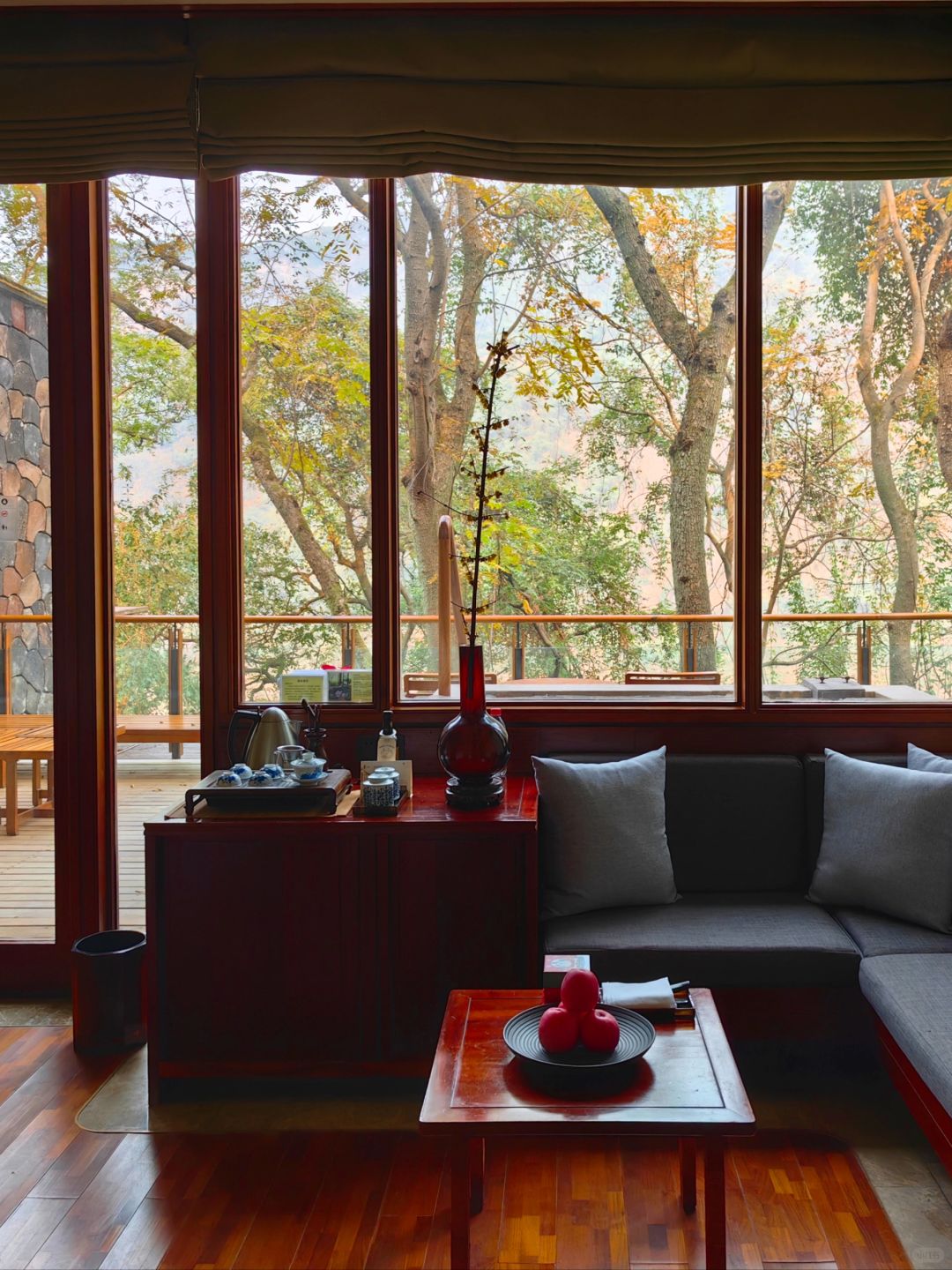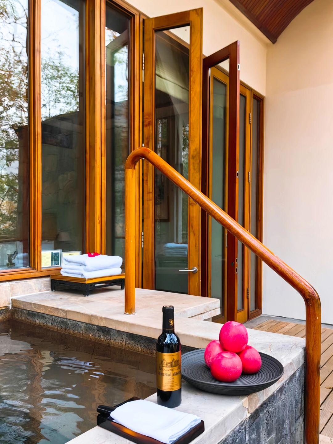 ✔️柏联入门的房型其实就已经很大了,达到了70平,但是很遗憾没有住过,因为我唯一一次预定江景精选客房,升级到了上一级江景经典汤屋,区别在于大10平米,其实两个房型差别不大。柏联的装修是我见过少数把中式酒店装的非常舒服的,内外大面积使用木材包裹搭配白色外墙十分高级。值得一提的是酒店每一处都针对原有的树木进行了独特设计。为了让原有树木保留打了很多的洞,却一点也不违和,反而和酒店融为一体。房间内的床正对嘉陵江,电视藏在床尾,需要的时候可以升起来,最重要的支持投屏!露台临崖而建视野超级绝,入户温泉是大名鼎鼎的北温泉水二次加热入户非常舒适,还会提供免费的玫瑰花瓣。备品是全套Le labo,minibar全免费,有全套的茶具加上柏联自产的普洱。有意思的是柏联的欢迎礼物统一是五个红色的苹果。