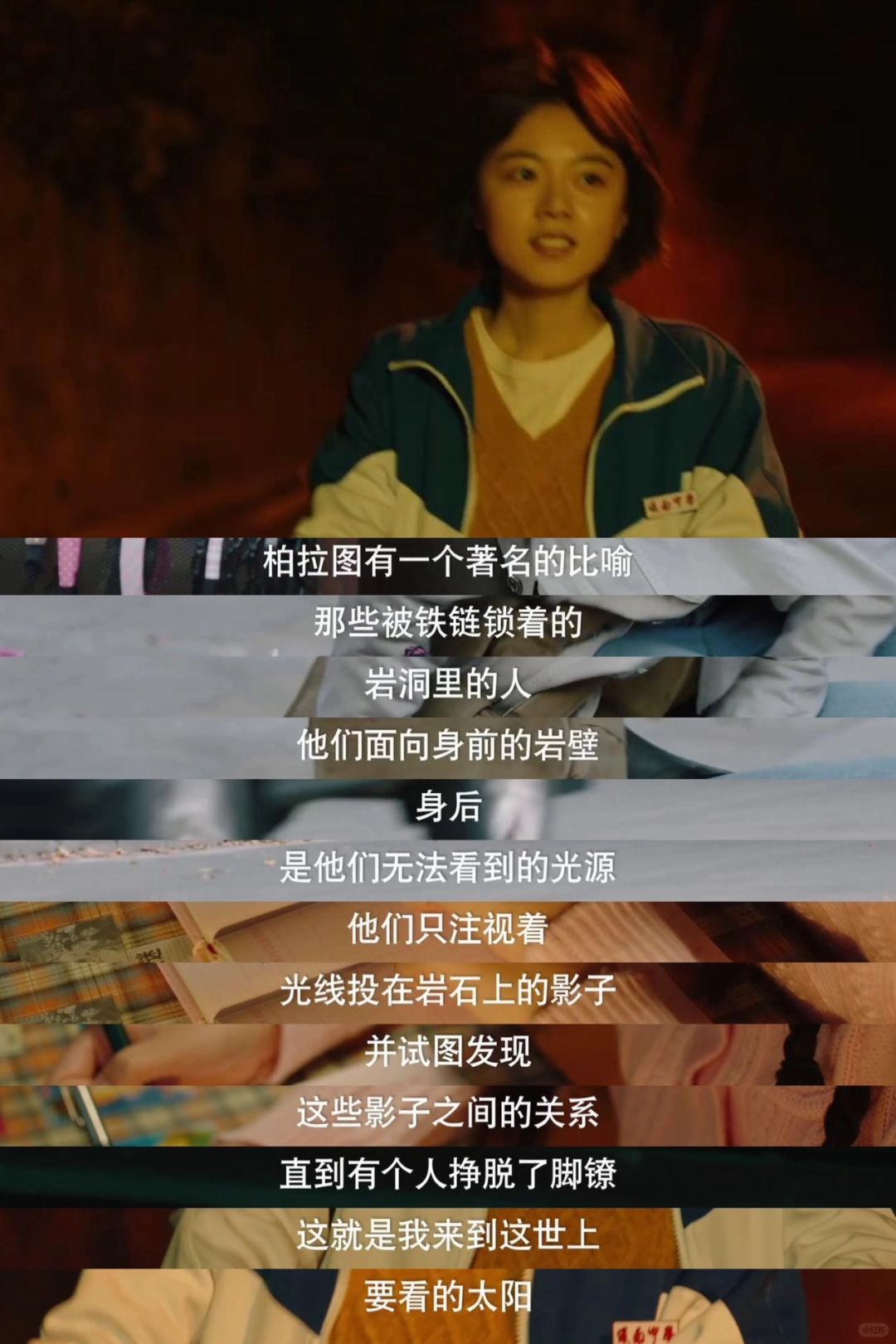 “柏拉图有一个著名的比喻,那些被铁链锁着的岩洞里的人无法看到光源,直到有个人挣脱了脚镣,这就是我来到这世上要看的太阳”