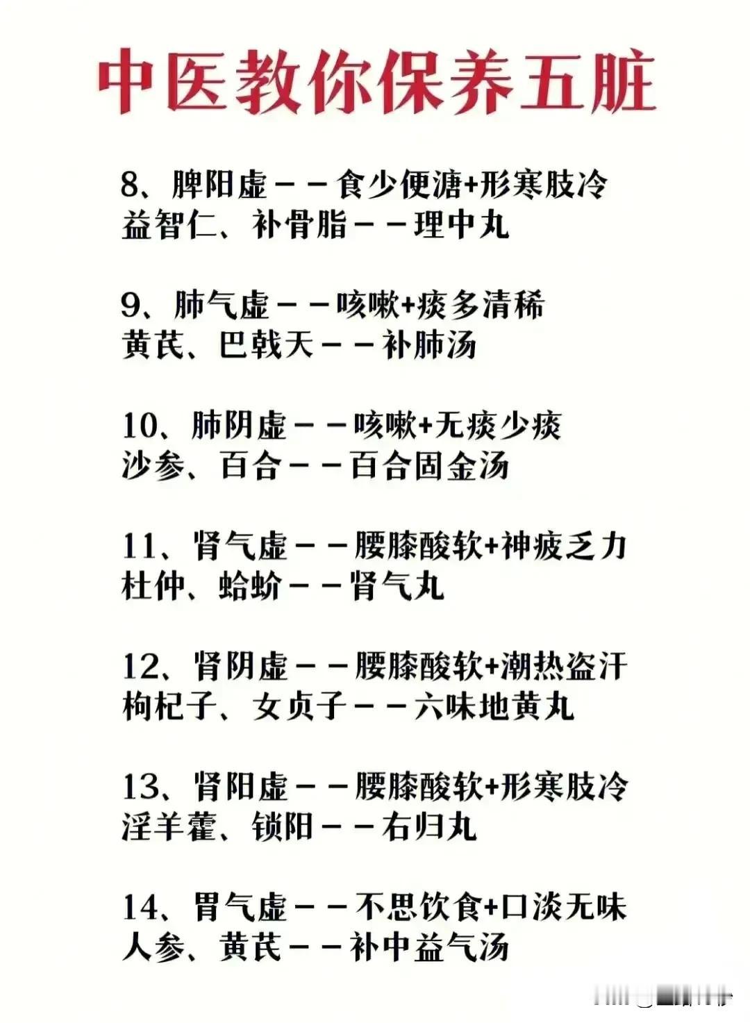 中医教你保养五脏,让你健康无忧 中医理论中,五脏是人体内部的重要器官,它们与人的生理、心理健康息息相关。保养五脏,对于维护身体健康具有至关重要的作用。下面,我们将从中医的角度,为大家介绍如何针对不同的五脏问题,进行有效的保养。 一、心脏保养 1. 心气虚:表现为气短出汗、面色淡白。建议用人参、五味子煎汤饮用,以养心安神。 2. 心阳虚:症状为气短出汗、面唇青紫。此时,可尝试用人参、刺五加煎制的保元汤,以温补心阳。 3. 心血虚:常表现为心烦失眠、面色苍白。推荐食用大枣、桑椹,或服用四物汤,以补血养心。 4. 心阴虚:症状为心烦失眠、咽干唇燥。此时,可服用由柏子仁、玉竹组成的补心丹,以滋养心阴。 二、肝脏保养 1. 肝血虚:视物模糊、面色无华。建议食用当归、熟地,或服用补肝汤,以养肝补血。 2. 肝阴虚:症状为视物模糊、咽干口苦。此时,可用女贞子、龟板煎制的贯煎,以滋补肝阴。 三、脾脏保养 1. 脾气虚:表现为食少便溏、神疲乏力。推荐用白术、山药煎汤,或服用四君子汤,以健脾益气。 2. 脾阳虚:症状为食少便溏、形寒肢冷。此时,可服用由益智仁、补骨脂组成的理中丸,以温补脾阳。 四、肺脏保养 1. 肺气虚:咳嗽、痰多清稀。建议食用黄芪、巴戟天,或服用补肺汤,以补肺益气。 2. 肺阴虚:症状为咳嗽、无痰少痰。此时,可服用由沙参、百合组成的百合固金汤,以养阴润肺。 五、肾脏保养 1. 肾气虚:腰膝酸软、神疲乏力。推荐食用杜仲、蛤蚧,或服用肾气丸,以补肾益气。 2. 肾阴虚:症状为腰膝酸软、潮热盗汗。此时,可服用由枸杞子、女贞子组成的六味地黄丸,以滋补肾阴。 3. 肾阳虚:腰膝酸软、形寒肢冷。建议服用由淫羊藿、锁阳组成的右归丸,以温补肾阳。 六、胃脏保养 1. 胃气虚:不思饮食、口淡无味。推荐用人参、黄芪煎制的补中益气汤,以健脾益气。 2. 胃阴虚:饥不欲食、口渴咽燥。此时,可服用由黄精、西洋参组成的益胃汤,以滋养胃阴。 3. 胃阳虚:胃疼泛酸、四肢厥冷。建议服用由干姜、附子组成的良附丸,以温补胃阳。 通过以上的介绍,相信大家对中医如何保养五脏有了一定的了解。在日常生活中,我们可以根据自己的身体状况,选择合适的保养方法。同时,保持良好的生活习惯和心态,也是维护身体健康的重要因素。让我们共同关注五脏健康,享受美好的生活吧!#健康科普# #清风计划#