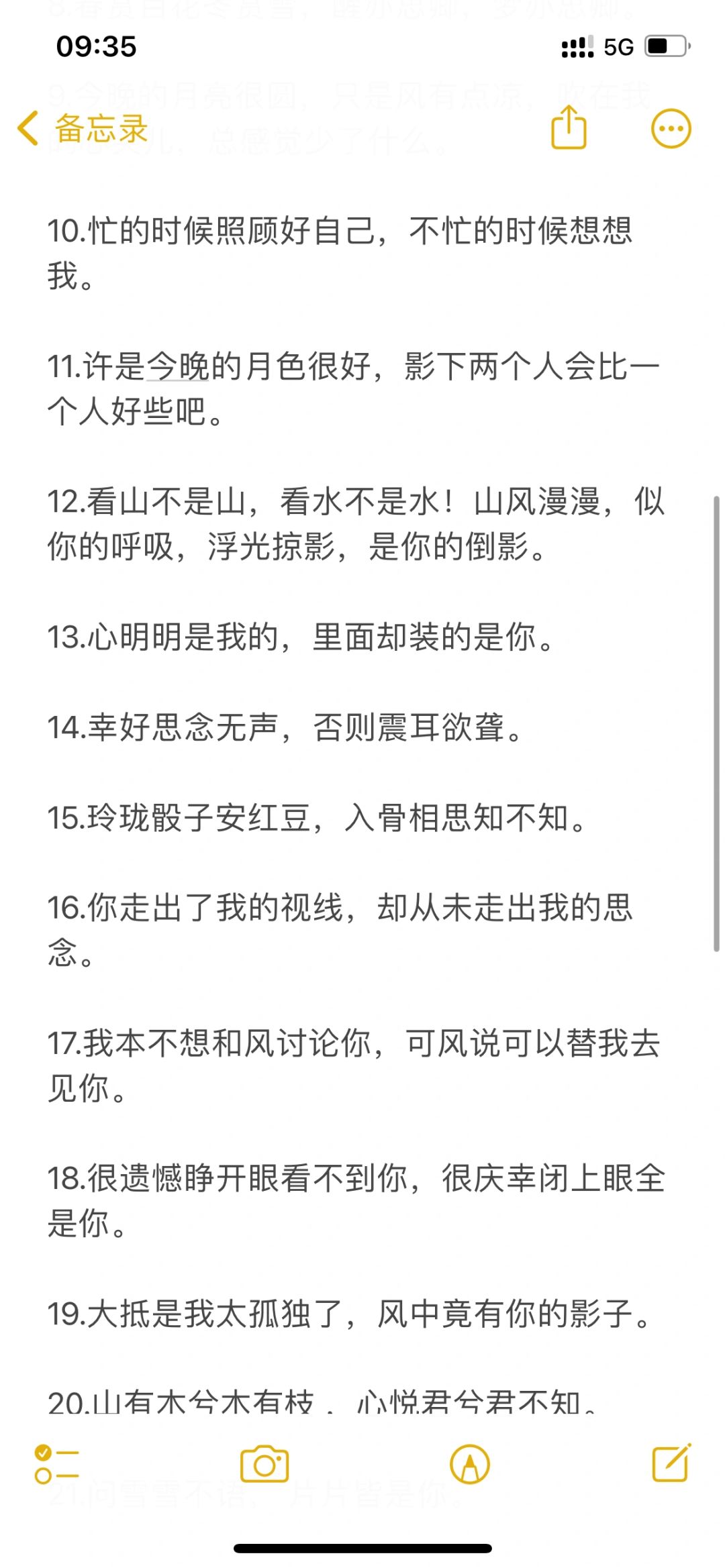 1.木目在心上,单人在尔旁。 2.玫瑰到了花期,我很想你。 3.不在你左右,却被你左右。 4.晓看天色暮看云,行也思君,坐也思君。 5.我想你现在肯定很忙,没关系你看前三个字就好。 6.月爬上漆黑的天空,心里时常觉得空落,原来是缺少了你。 7.山河远阔,所念星河,无一是你,无一不是你。 8.春赏百花冬赏雪,醒亦思卿,梦亦思卿。 9.今晚的月亮很圆,只是风有点凉,吹在我的心尖儿,总感觉少了什么。 10.忙的时候照顾好自己,不忙的时候想想我。