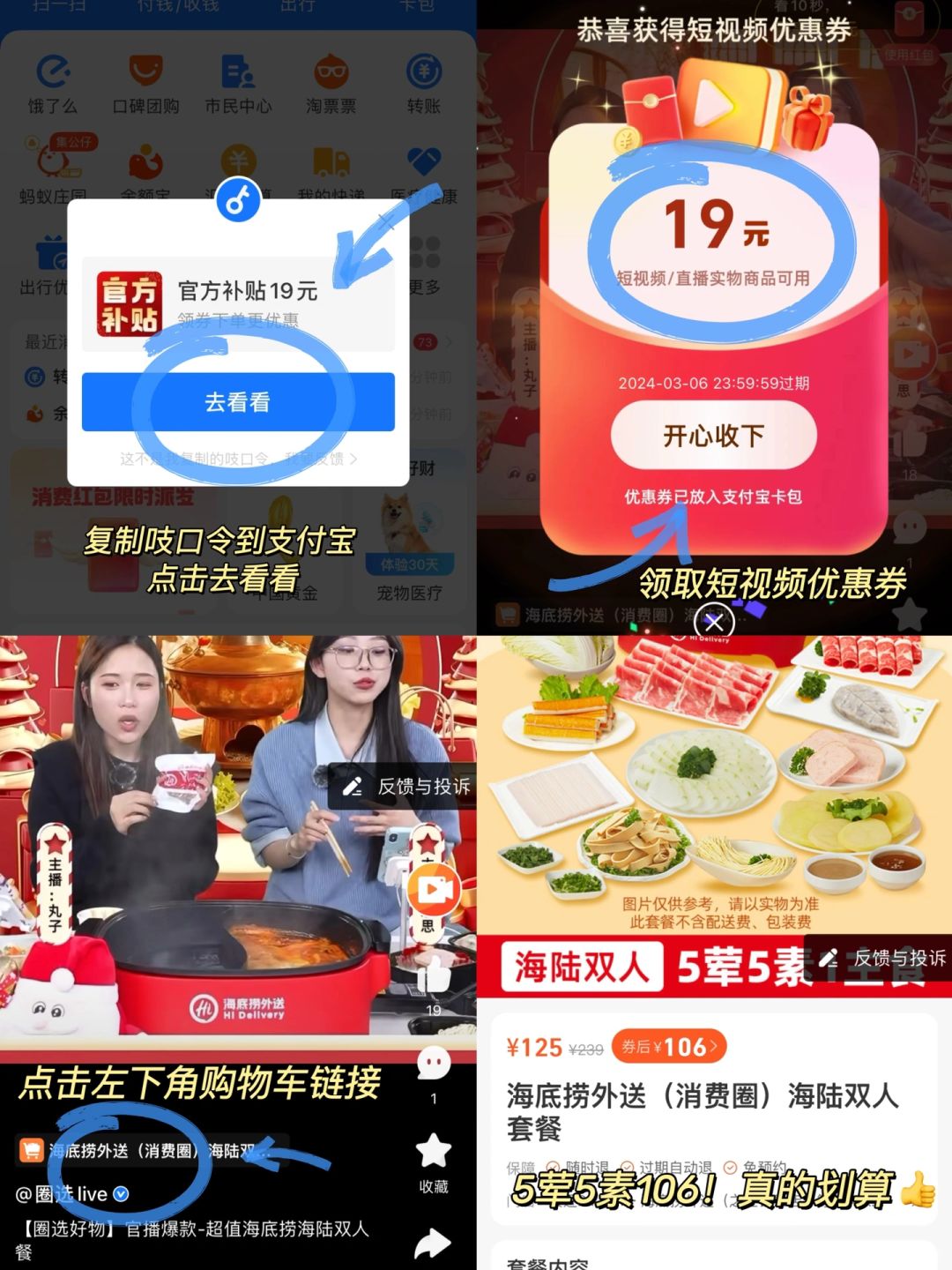 不知道海底捞外送的大羊毛的人有难咯!!! 106💰拿下了海底捞外送大促海陆双人套餐!!! 这个优惠程度谁懂啊!真的薅到就是赚到!!! ✅操作步骤 评论区复制吱口令➡️打开支付宝跳转到短视频➡️补贴弹窗➡️点击小蓝车购买~ 轻轻松松足不出户在家实现海底捞自由啦🆓~ 该省省该花花,有了支付宝消费圈官播【圈选live】 尊嘟太棒啦!
