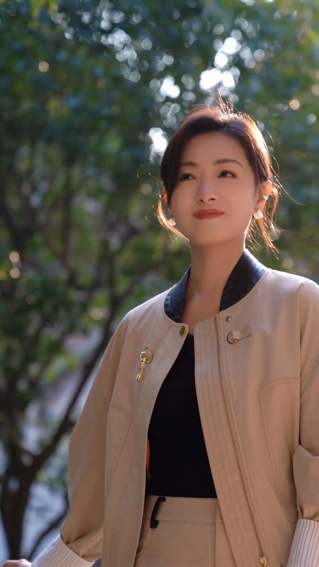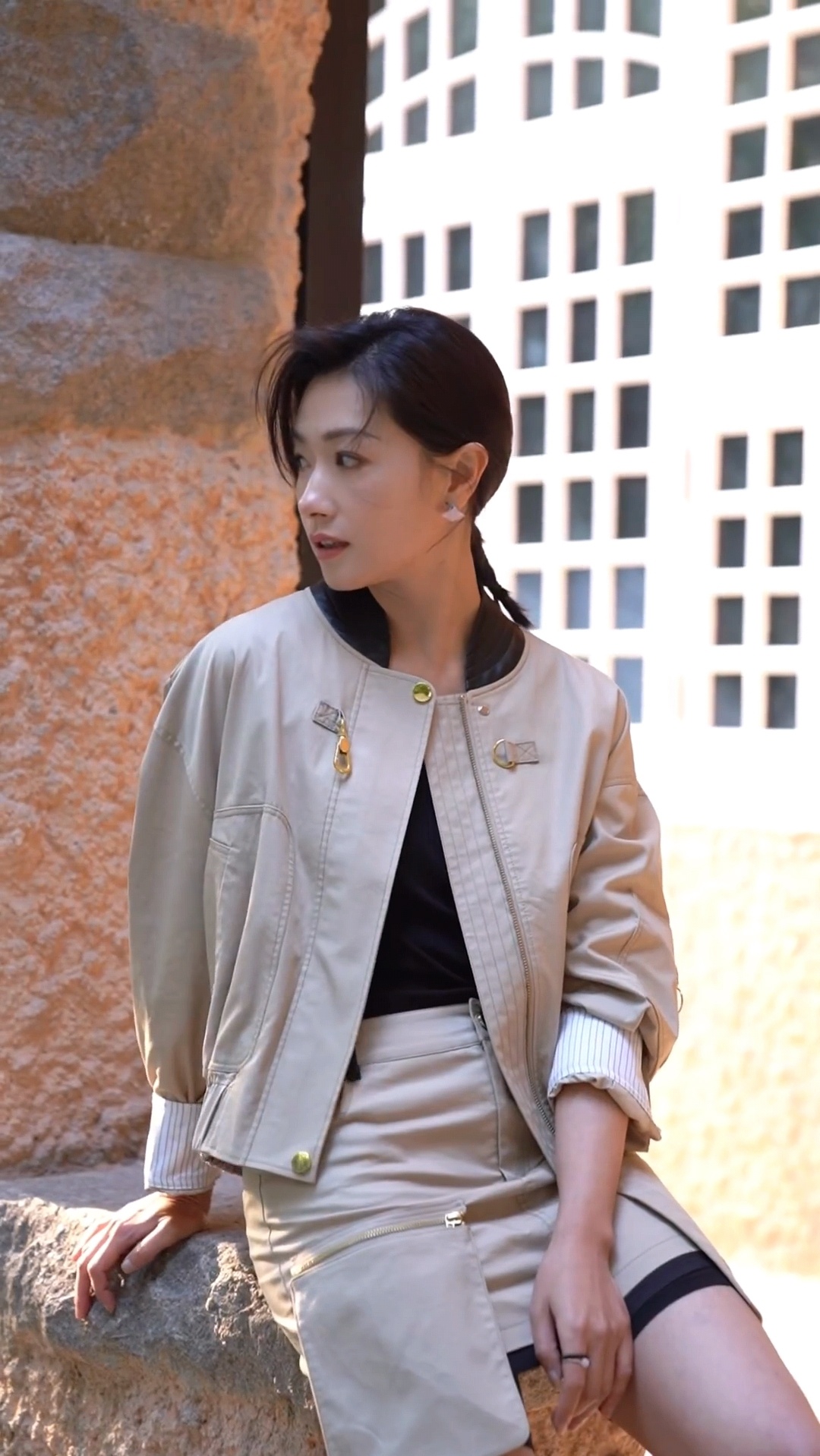 #万茜丝袜配运动鞋# 万茜卡其色套装搭配黑色丝袜运动鞋造型,好春天!