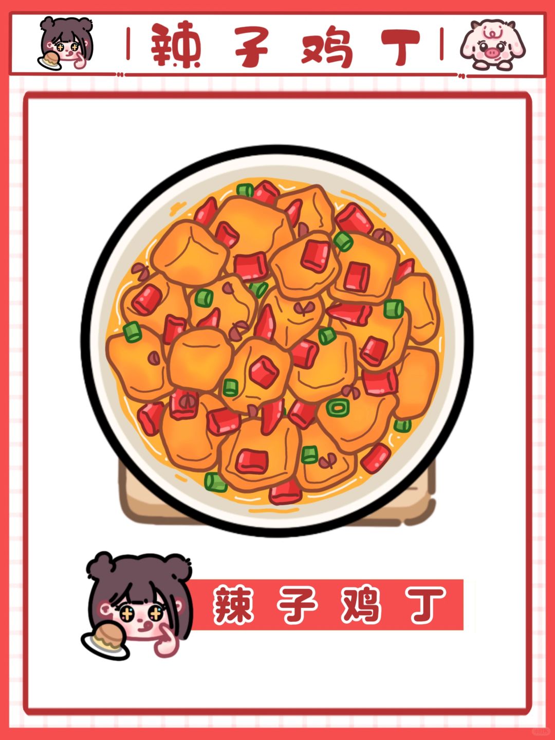 今日份麻辣入味的辣子鸡丁🐔来喽!这是年前宝宝点的菜了😭居然现在才出,后面一定会努力更新的💪(最近在思考🤔周边的事情 所以比较忙 打算出一个新的专门做甜品 饮品的模版 可以做一些美丽的折页食谱📖)家常菜的胶带已经在画啦~可以多多注意这里 是我的文创小铺 周边都会发在这里的 都是一些关于吃吃喝喝的产品👍转入正题🤫我真的超爱辣子鸡🌶️直接当零食吃停不下来的那种,辣椒🌶️也可以炸一下 酥酥脆脆也非常香💖