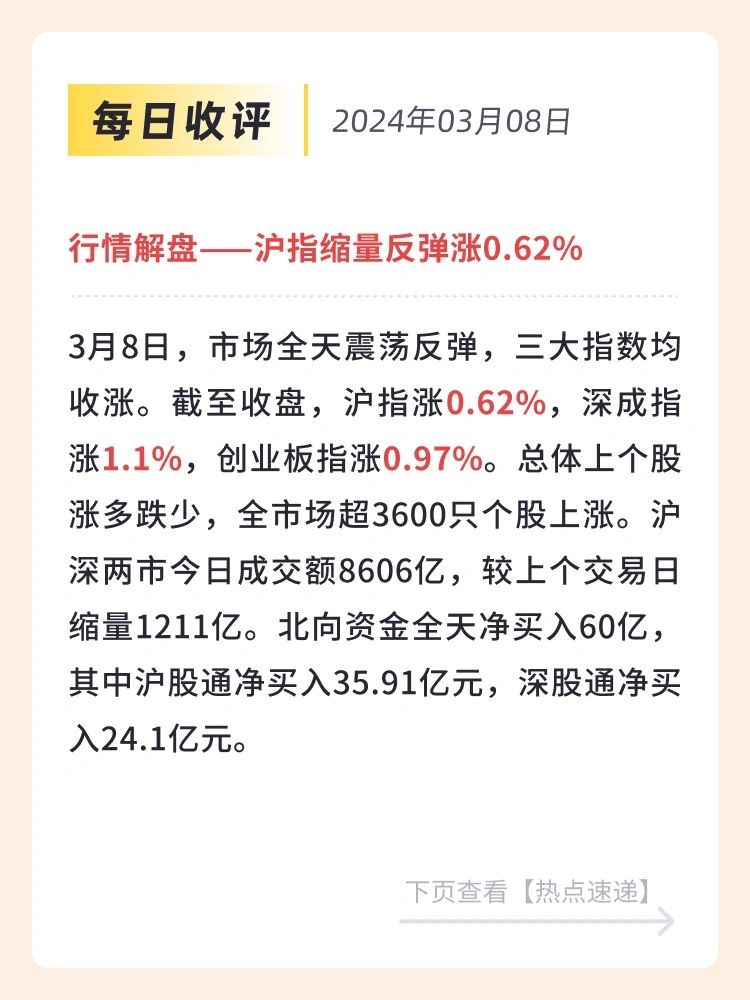 👉 3月8日,市场全天震荡反弹,三大指数均收涨。截至收盘,沪指涨0.62%,深成指涨1.1%,创业板指涨0.97%。总体上个股涨多跌少,全市场超3600只个股上涨。沪深两市今日成交额8606亿,较上个交易日缩量1211亿。北向资金全天净买入60亿,其中沪股通净买入35.91亿元,深股通净买入24.1亿元。
