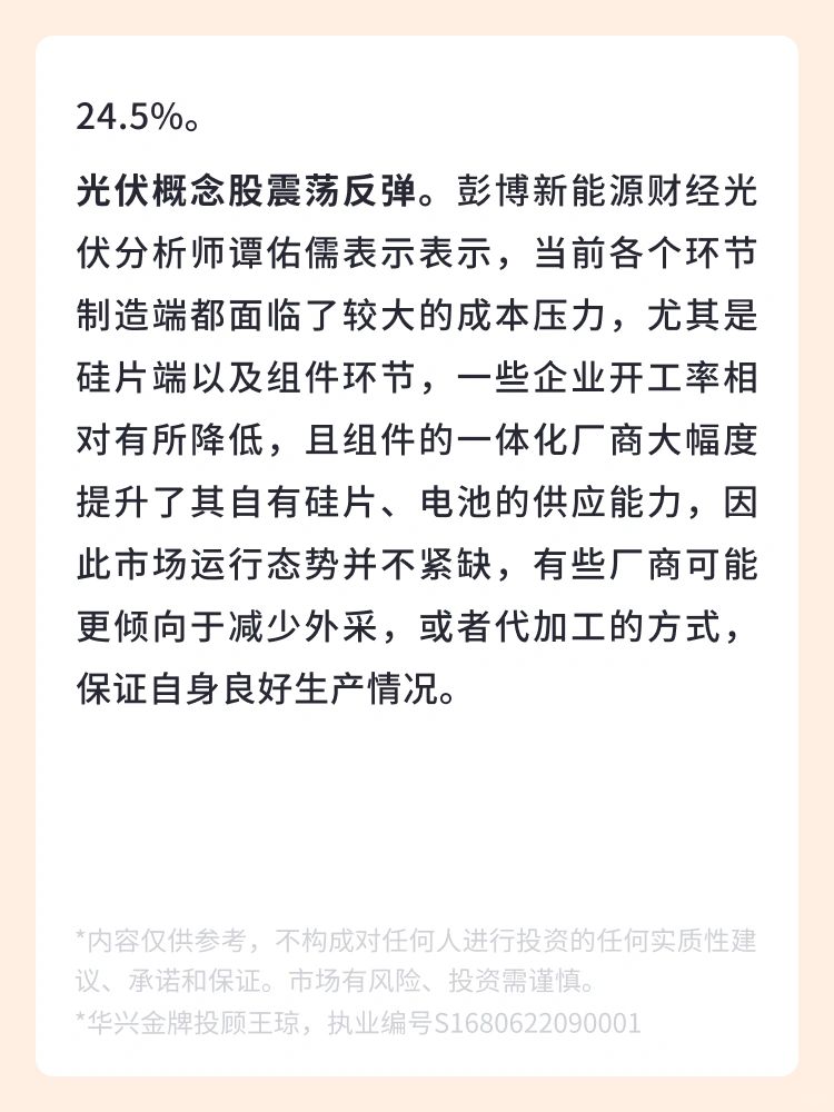 👉 光伏概念股震荡反弹。彭博新能源财经光伏分析师谭佑儒表示,当前各个环节制造端都面临了较大的成本压力,尤其是硅片端以及组件环节,一些企业开工率相对有所降低,且组件的一体化厂商大幅度提升了其自有硅片、电池的供应能力,因此市场运行态势并不紧缺,有些厂商可能更倾向于减少外采,或者代加工的方式,保证自身良好生产情况。