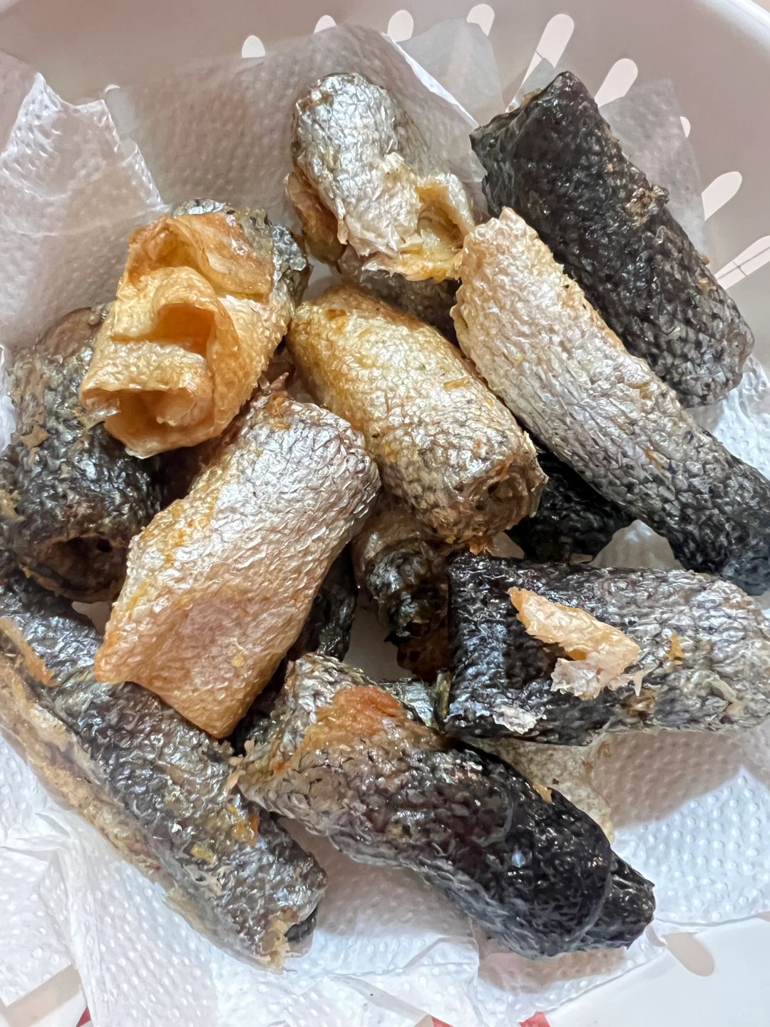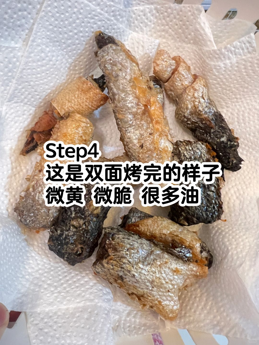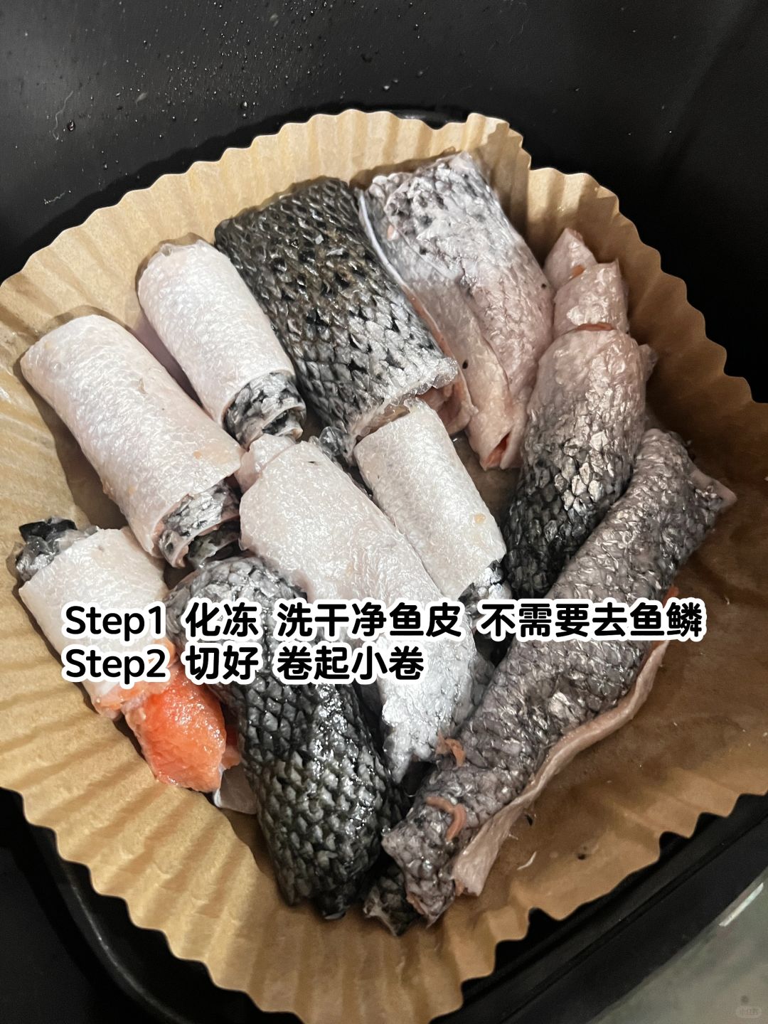 小狗馋哭了 妈妈做的快yue了 买了三文鱼皮(边角料) 速冻的那种 回来之后化冻 整整五斤 还带着鱼鳞 打开化冻的时候那个味道 久久不能忘怀 [星R][星R][星R]分享[星R][星R][星R] 步骤很简单: [一R]化冻 [二R]一整张鱼皮洗一下 鱼鳞不需要去掉 [三R]切成四块或者横着切两块 卷起来 [四R]空气炸锅200℃ 烤20mins [五R]之后翻过来另一面再200℃ 烤20mins [六R]拿出来后凉干 脆脆的 超级香 另外一定要用厨房用纸把油吸一吸 三文鱼油脂很多了