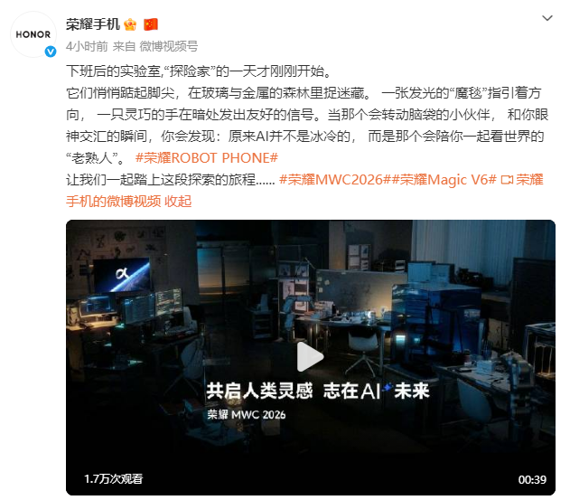 此外, @荣耀手机 还发布了ROBOT PHONE机器人手机的预热视频,并配文称,“下班后的实验室,“探险家”的一天才刚刚开始。它们悄悄踮起脚尖,在玻璃与金属的森林里捉迷藏。 一张发光的“魔毯”指引着方向, 一只灵巧的手在暗处发出友好的信号。当那个会转动脑袋的小伙伴, 和你眼神交汇的瞬间,你会发现:原来AI并不是冰冷的, 而是那个会陪你一起看世界的“老熟人”。 #荣耀ROBOT PHONE# 让我们一起踏上这段探索的旅程...... #荣耀MWC2026##荣耀Magic V6#”。
