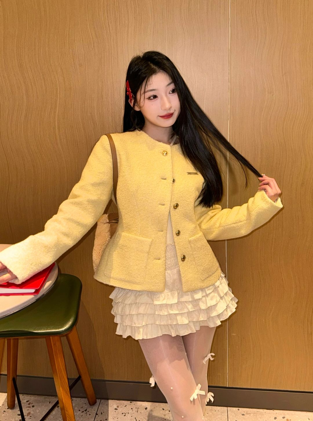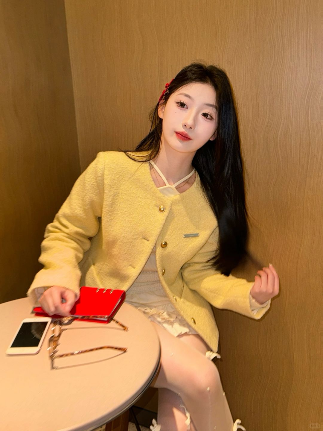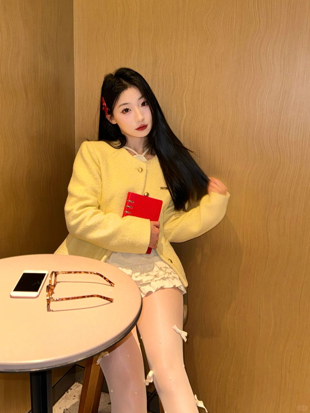 奶黄色小香风外套+蕾丝蛋糕裙+蝴蝶结白丝 好温柔啊