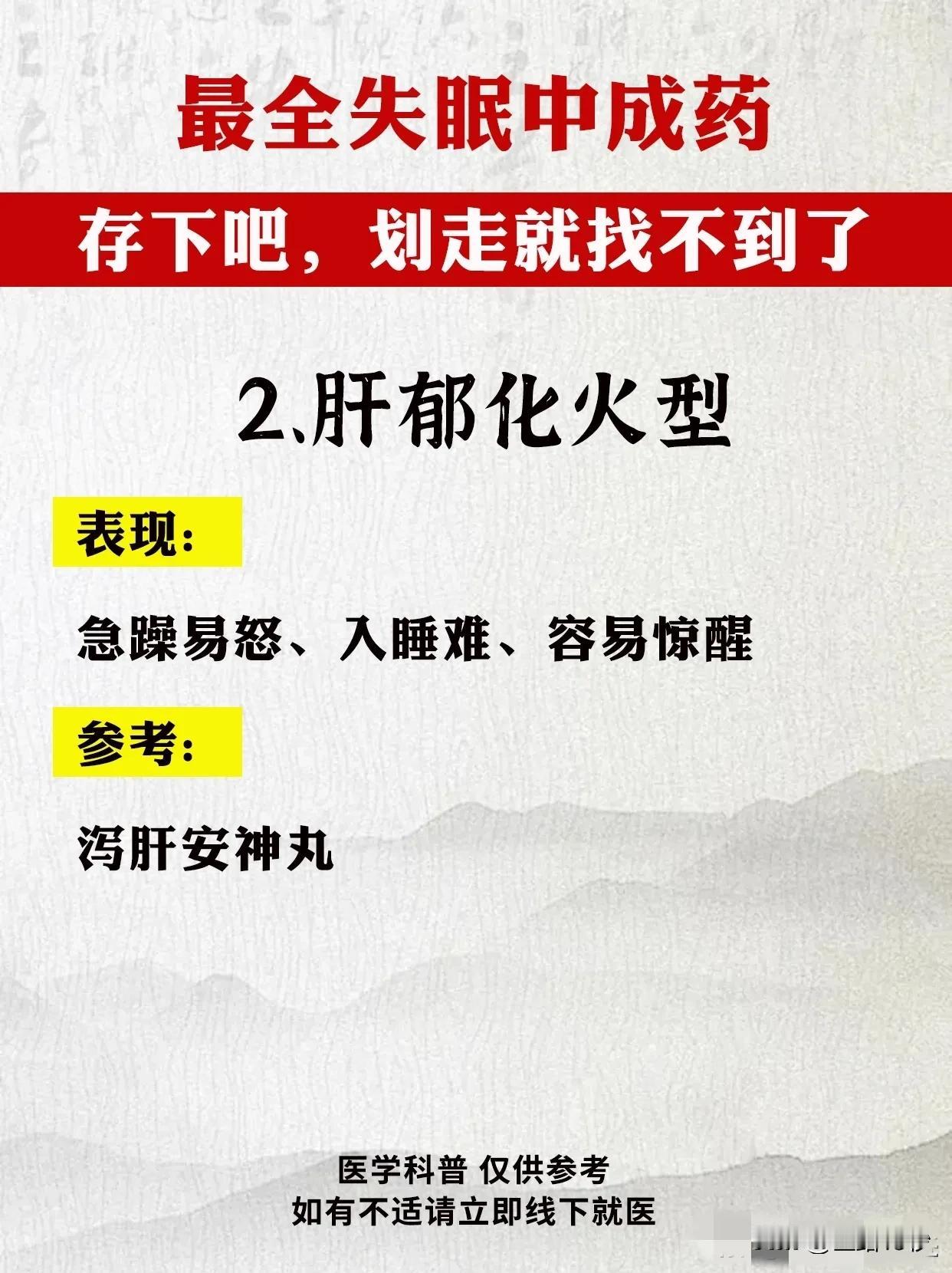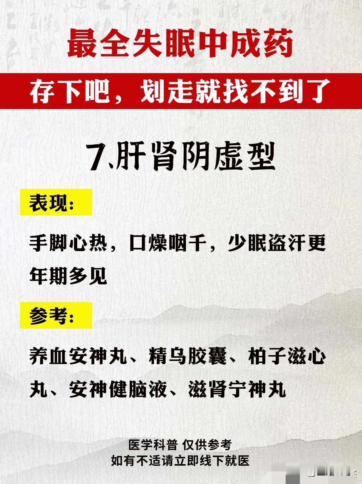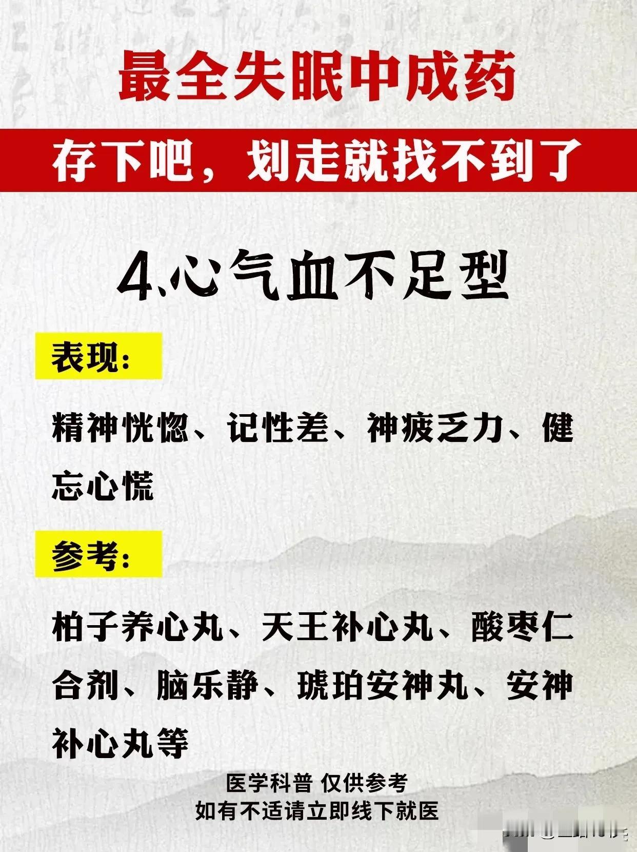 最全失眠中成药指南:告别困扰,重拾健康睡眠 失眠,已成为现代人生活中的一大困扰。面对这一问题,中成药以其独特的疗效和温和的性质,逐渐受到广大患者的青睐。今天,我们就为大家带来最全面的失眠中成药指南,希望能帮助您告别困扰,重拾健康睡眠。 首先,我们需要了解失眠的类型及症状。失眠可分为肝气郁结型、肝郁化火型、心火亢盛型、心气血不足型、心脾两虚型、心虚胆怯型、肝肾阴虚型和脾肾阳虚型等。不同类型的失眠症状各不相同,因此需要对症下药。 接下来,我们为大家推荐针对不同类型失眠的中成药。 1. 肝气郁结型:解郁安神颗粒、逍遥丸、加味逍遥丸。这些药物具有疏肝解郁、安神定志的功效,适用于精神抑郁、常叹气、生闷气等症状。 2. 肝郁化火型:泻肝安神丸。此药具有清肝泻火、安神定志的作用,适用于急躁易怒、入睡难、容易惊醒等症状。 3. 心火亢盛型:朱砂安神丸、磁朱丸。这些药物能够清心泻火、安神定志,适用于心跳快、心慌、心烦乱等症状。 4. 心气血不足型:柏子养心丸、天王补心丸、酸枣仁合剂、脑乐静、琥珀安神丸、安神补心丸等。这些药物能够补益心气、养血安神,适用于精神恍惚、记性差、神疲乏力等症状。 5. 心脾两虚型:归脾丸。此药具有健脾养心、安神定志的作用,适用于多梦易醒、醒后难入睡、没精神等症状。 6. 心虚胆怯型:安神温胆丸、安神定志丸。这些药物能够养心安神、定志止惊,适用于容易害怕、心慌、睡眠中易惊醒等症状。 7. 肝肾阴虚型:养血安神丸、精乌胶囊、柏子滋心丸、安神健脑液、滋肾宁神丸。这些药物能够滋补肝肾、养血安神,适用于手脚心热、口燥咽干、少眠盗汗等症状。 8. 脾肾阳虚型:刺五加胶囊、龟鹿补肾丸、神衰康颗粒、甜梦胶囊。这些药物能够温补脾肾、安神定志,适用于睡眠质量差、容易累、怕冷四肢凉等症状。 在使用中成药治疗失眠时,请务必遵循医生的建议和指导。同时,保持良好的生活习惯和心态,合理安排作息时间,避免过度劳累和压力。相信在中成药的帮助下,您一定能够告别失眠困扰,重拾健康睡眠。