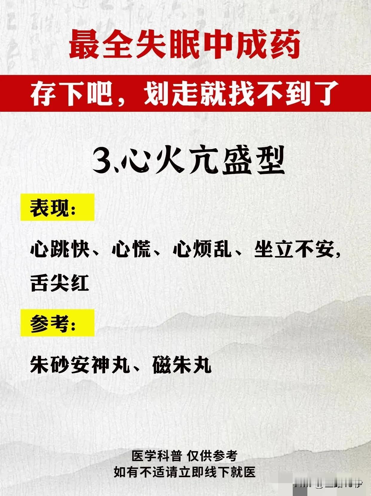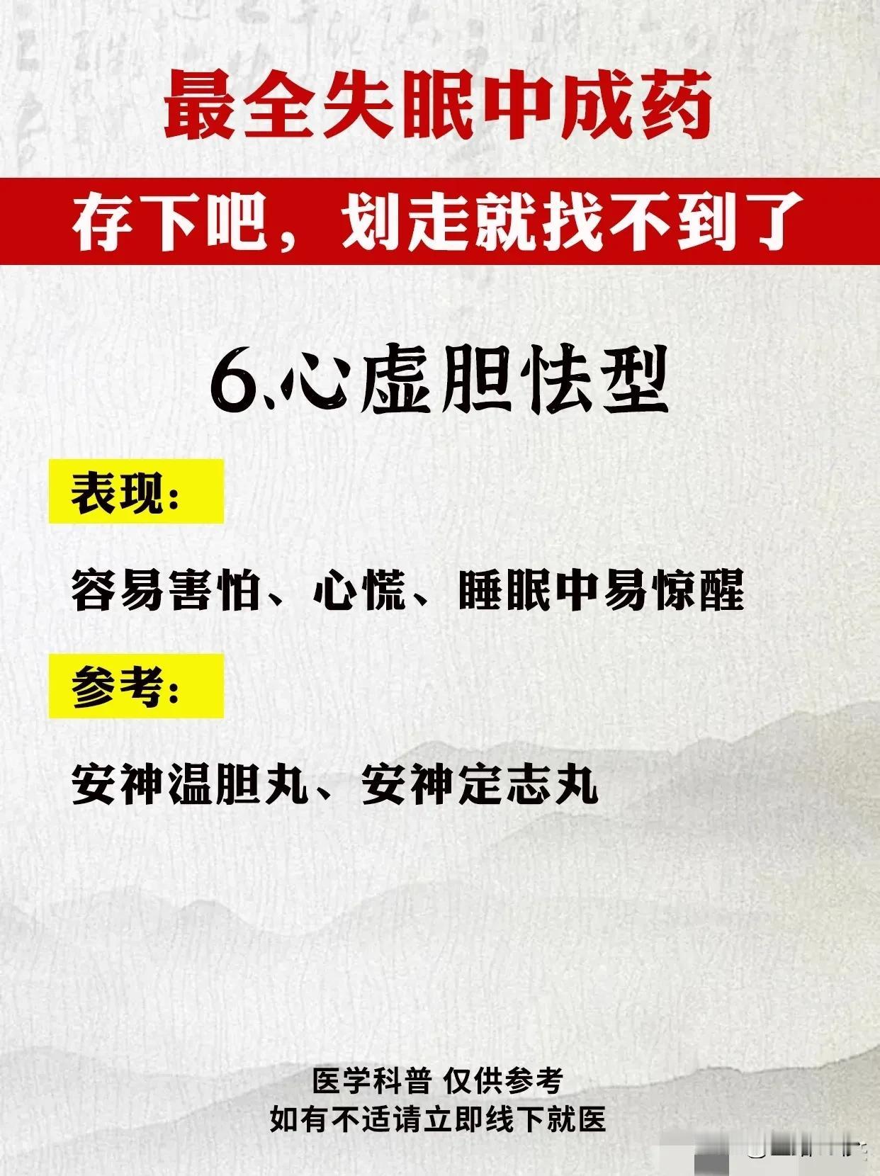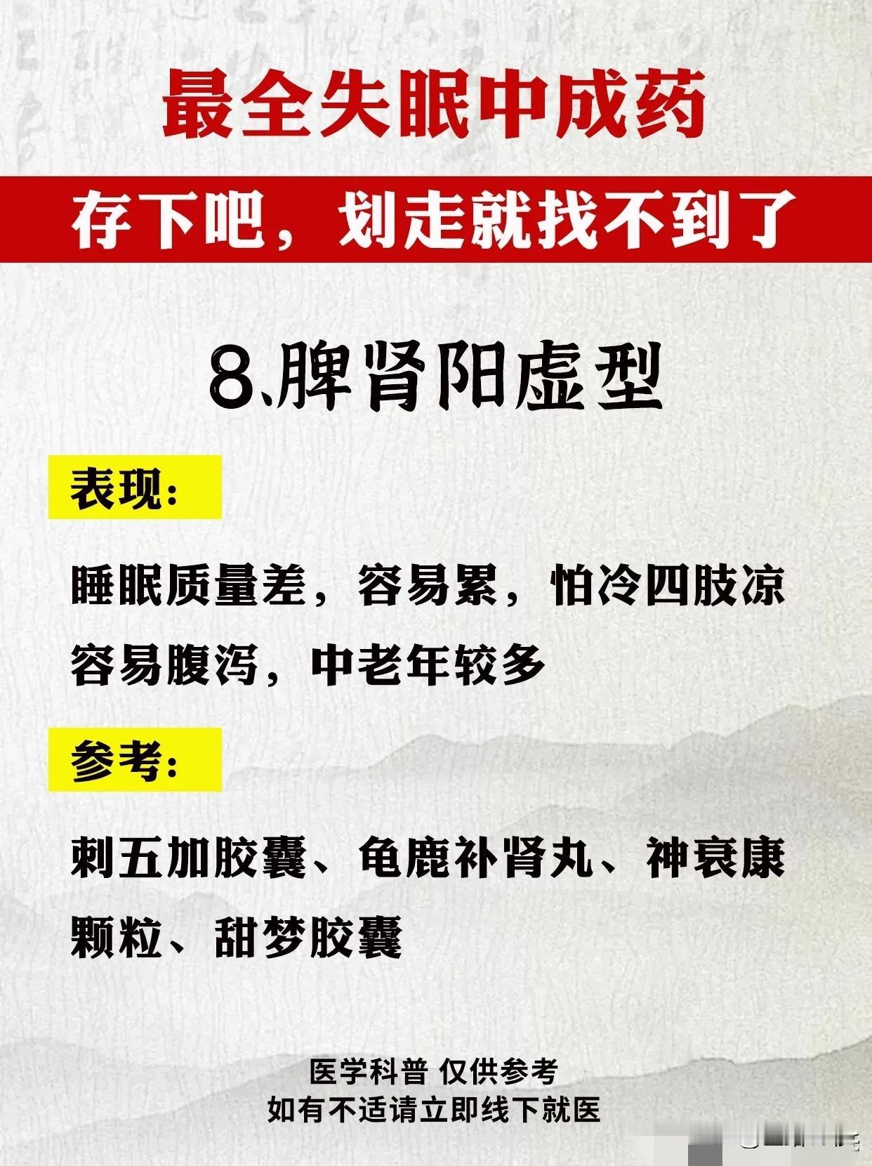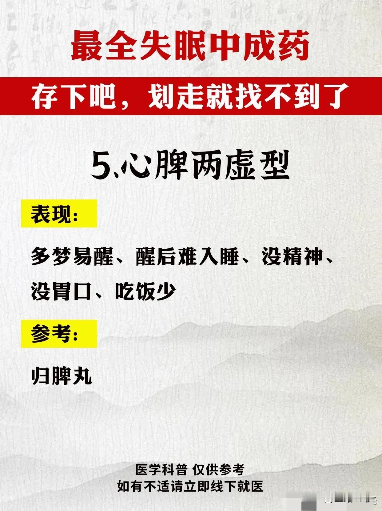 最全失眠中成药指南:告别困扰,重拾健康睡眠 失眠,已成为现代人生活中的一大困扰。面对这一问题,中成药以其独特的疗效和温和的性质,逐渐受到广大患者的青睐。今天,我们就为大家带来最全面的失眠中成药指南,希望能帮助您告别困扰,重拾健康睡眠。 首先,我们需要了解失眠的类型及症状。失眠可分为肝气郁结型、肝郁化火型、心火亢盛型、心气血不足型、心脾两虚型、心虚胆怯型、肝肾阴虚型和脾肾阳虚型等。不同类型的失眠症状各不相同,因此需要对症下药。 接下来,我们为大家推荐针对不同类型失眠的中成药。 1. 肝气郁结型:解郁安神颗粒、逍遥丸、加味逍遥丸。这些药物具有疏肝解郁、安神定志的功效,适用于精神抑郁、常叹气、生闷气等症状。 2. 肝郁化火型:泻肝安神丸。此药具有清肝泻火、安神定志的作用,适用于急躁易怒、入睡难、容易惊醒等症状。 3. 心火亢盛型:朱砂安神丸、磁朱丸。这些药物能够清心泻火、安神定志,适用于心跳快、心慌、心烦乱等症状。 4. 心气血不足型:柏子养心丸、天王补心丸、酸枣仁合剂、脑乐静、琥珀安神丸、安神补心丸等。这些药物能够补益心气、养血安神,适用于精神恍惚、记性差、神疲乏力等症状。 5. 心脾两虚型:归脾丸。此药具有健脾养心、安神定志的作用,适用于多梦易醒、醒后难入睡、没精神等症状。 6. 心虚胆怯型:安神温胆丸、安神定志丸。这些药物能够养心安神、定志止惊,适用于容易害怕、心慌、睡眠中易惊醒等症状。 7. 肝肾阴虚型:养血安神丸、精乌胶囊、柏子滋心丸、安神健脑液、滋肾宁神丸。这些药物能够滋补肝肾、养血安神,适用于手脚心热、口燥咽干、少眠盗汗等症状。 8. 脾肾阳虚型:刺五加胶囊、龟鹿补肾丸、神衰康颗粒、甜梦胶囊。这些药物能够温补脾肾、安神定志,适用于睡眠质量差、容易累、怕冷四肢凉等症状。 在使用中成药治疗失眠时,请务必遵循医生的建议和指导。同时,保持良好的生活习惯和心态,合理安排作息时间,避免过度劳累和压力。相信在中成药的帮助下,您一定能够告别失眠困扰,重拾健康睡眠。