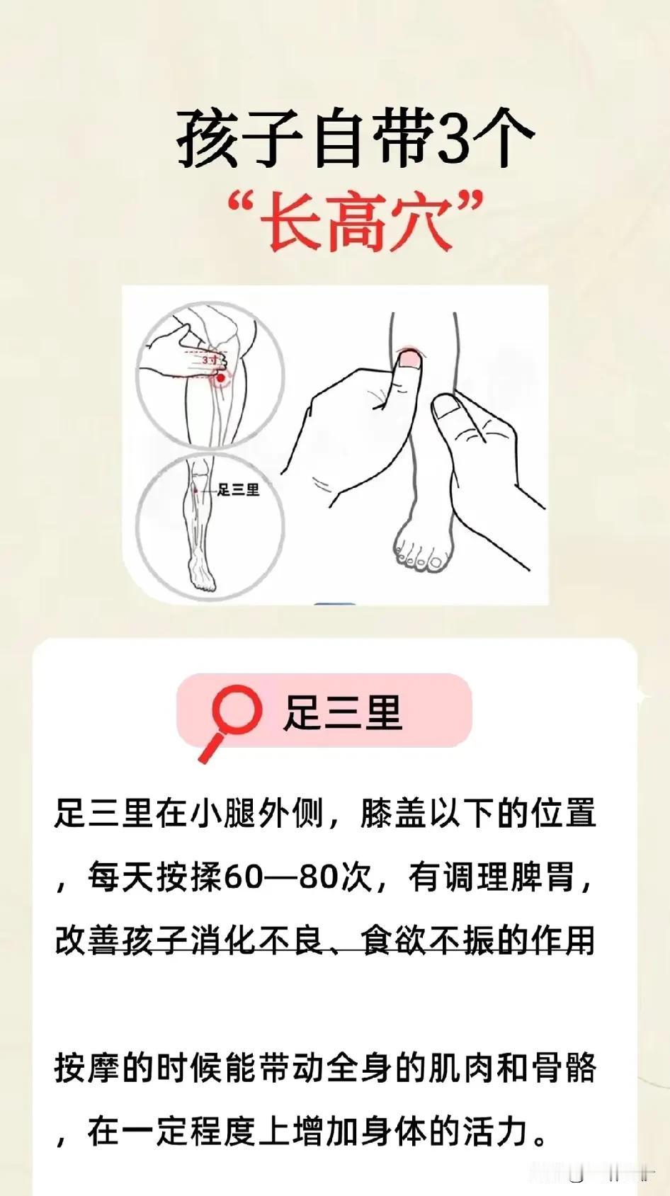 孩子自带的长高秘密 你知道吗?每个孩子身上都自带了3个“长高穴”!家长们,想要孩子长得更高更健康,不妨试试按摩这些穴位吧! 三阴交:位于小腿内侧,每天轻轻按揉30-50次,不仅能滋阴健脾,还能补气益肾。消化不良、腹胀、腹痛、腹泻,这些小毛病,三阴交都能帮上忙! 涌泉穴:就在脚底心,每天按揉50次左右,就能滋肾清热。孩子长高,肾中精气是关键。肾主骨、生髓,孩子的骨骼发育离不开它! 足三里:位于小腿外侧,膝盖以下。每天按揉60-80次,能调理脾胃,改善孩子消化不良、食欲不振。按摩时,全身的肌肉和骨骼都能得到活动,增加身体活力! 每天花几分钟,按按这些穴位,孩子的健康和身高都能得到呵护