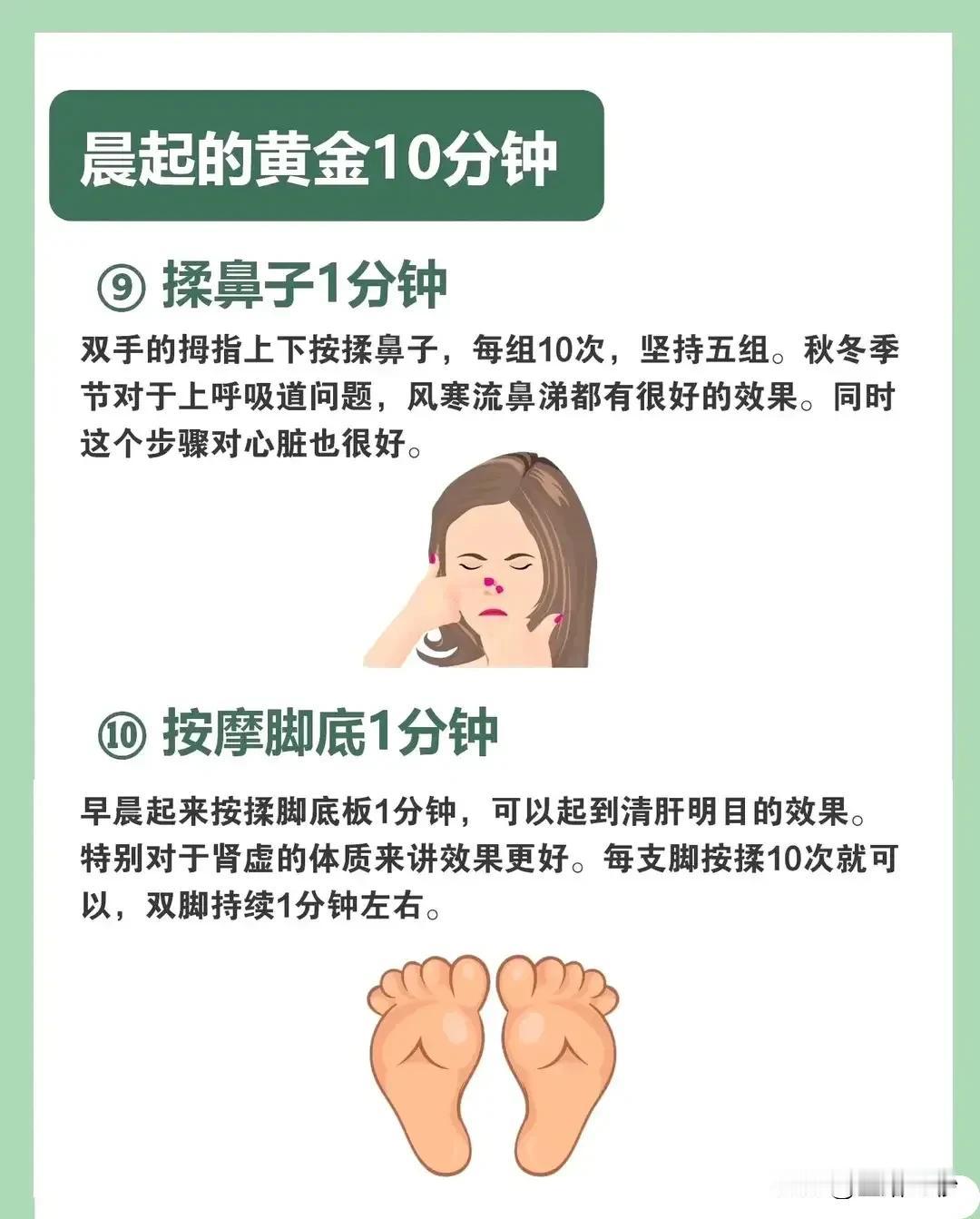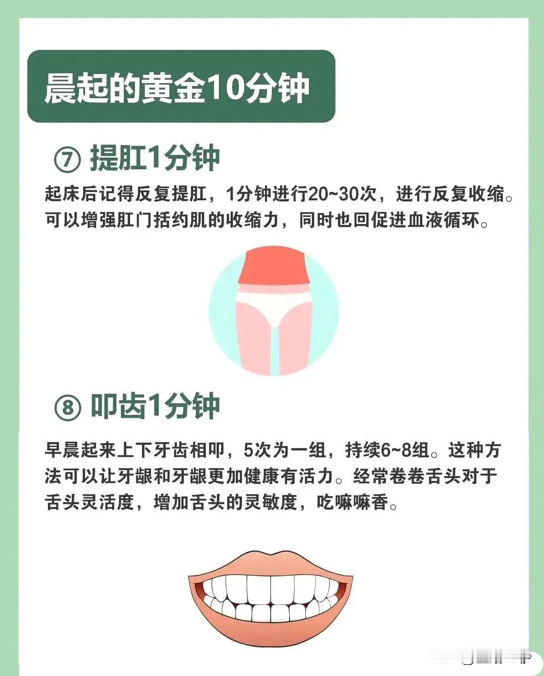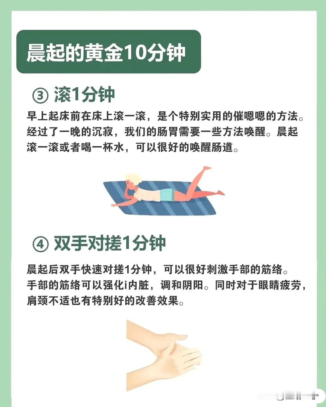 晨起的黄金10分钟,你get到了吗? 早晨醒来,别再匆匆忙忙地起床,给自己留下宝贵的10分钟吧!这10分钟,或许就是你一天中最值得投资的“黄金时间”。 ① 赖床1分钟,不要猛地起身,让身体慢慢苏醒,感受清晨的宁静与平和。 ② 梳头1分钟,用梳子或手指从前额梳到后脑勺,既能提神醒脑,又能促进头皮血液循环。 ③ 滚1分钟,在床上轻轻翻滚,唤醒沉睡的肠胃,为一天的新陈代谢做好准备。 ④ 双手对搓1分钟,刺激手部筋络,调和阴阳,改善肩颈不适和眼睛疲劳。 ⑤ 揉耳朵1分钟,轻轻揉捏耳轮,保健听力,改善记忆力和耳鸣目眩。 ⑥ 转眼睛1分钟,顺时针和逆时针转动眼球,提神醒目,锻炼眼部肌肉。 ⑦ 提肛1分钟,反复提肛,增强肛门括约肌的收缩力,促进血液循环。 ⑧ 齿1分钟,上下牙齿相叩,保持牙龈健康,增加舌头灵敏度。 ⑨ 揉鼻子1分钟,按揉鼻子,预防上呼吸道问题,增强心脏功能。 ⑩ 按摩脚底1分钟,清肝明目,尤其对肾虚体质效果更好。 这10个简单的小动作,每个只需1分钟,却能为你的健康加分。从今天开始,让我们一起珍惜晨起的黄金10分钟吧!#晨起养生# #黄金10分钟# #健康生活#