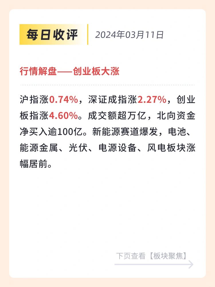 👉 沪指涨0.74%,深证成指涨2.27%,创业板指涨4.60%。成交额超万亿,北向资金净买入逾100亿。新能源赛道爆发,电池、能源金属、光伏、电源设备、风电板块涨幅居前。