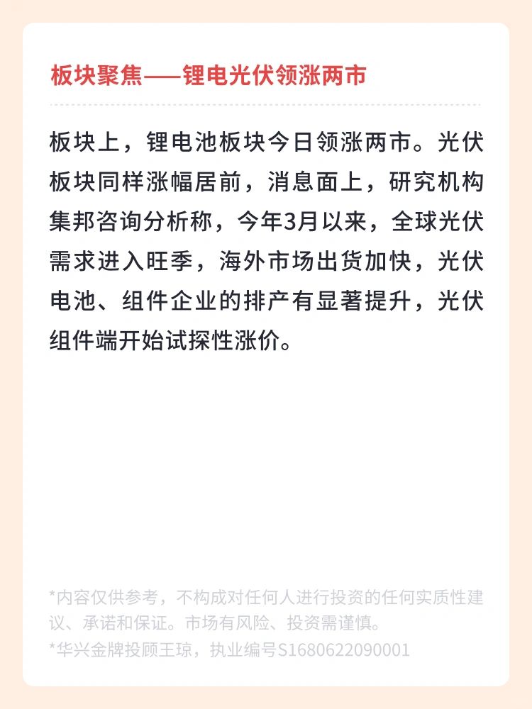 👉 板块上,锂电池板块今日领涨两市。光伏板块同样涨幅居前,消息面上,研究机构集邦咨询分析称,今年3月以来,全球光伏需求进入旺季,海外市场出货加快,光伏电池、组件企业的排产有显著提升,光伏组件端开始试探性涨价。