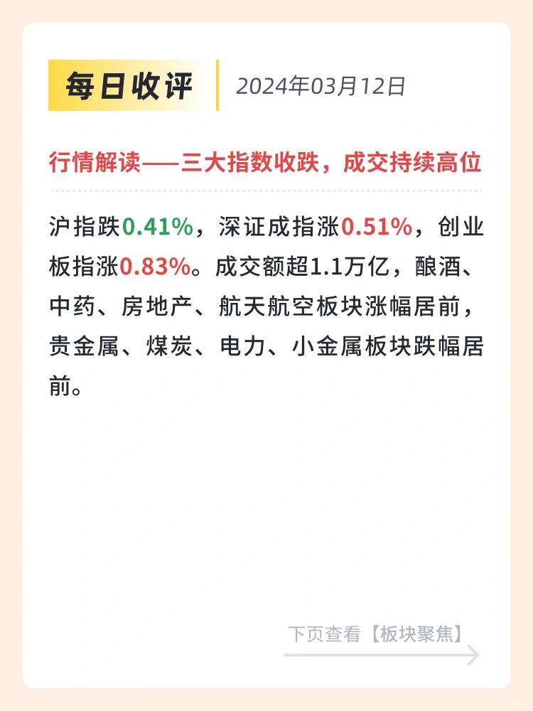 👉 沪指跌0.41%,深证成指涨0.51%,创业板指涨0.83%。成交额超1.1万亿,酿酒、中药、房地产、航天航空板块涨幅居前,贵金属、煤炭、电力、小金属板块跌幅居前。