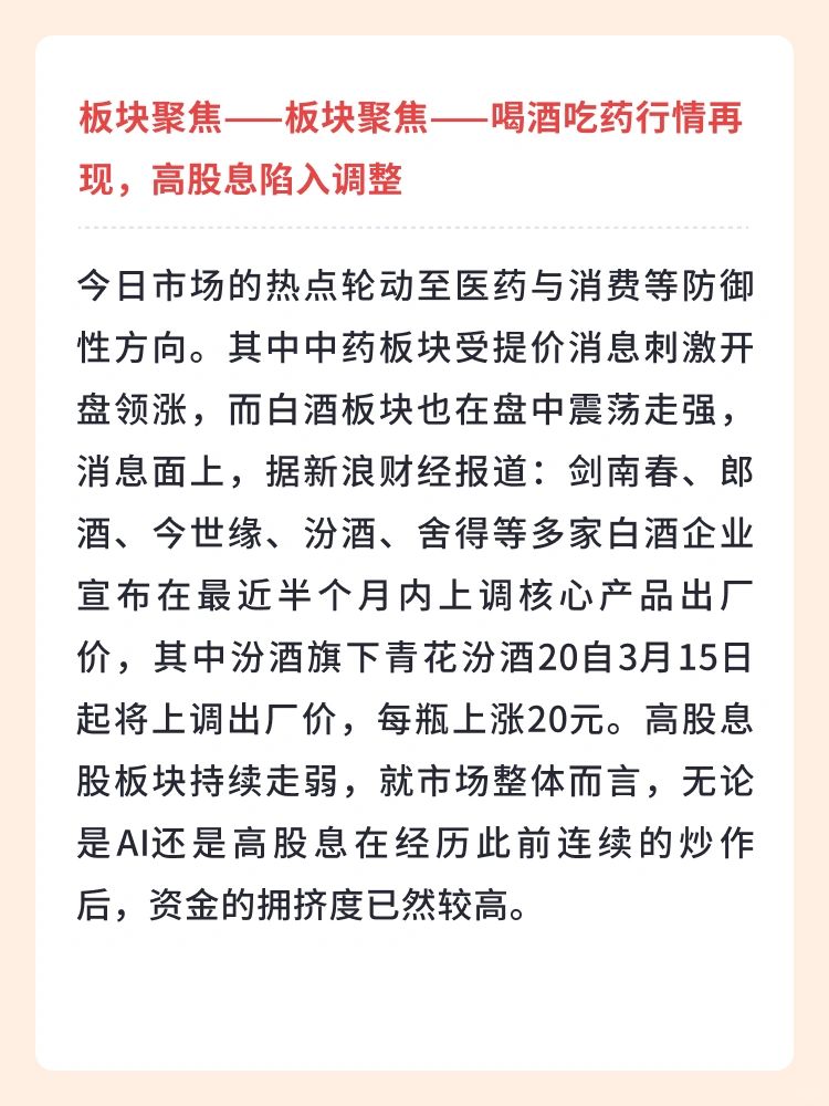 👉 今日市场的热点轮动至医药与消费等防御性方向。其中中药板块受提价消息刺激开盘领涨,而白酒板块也在盘中震荡走强,消息面上,据新浪财经报道:剑南春、郎酒、今世缘、汾酒、舍得等多家白酒企业宣布在最近半个月内上调核心产品出厂价,其中汾酒旗下青花汾酒20自3月15日起将上调出厂价,每瓶上涨20元。高股息股板块持续走弱,就市场整体而言,无论是AI还是高股息在经历此前连续的炒作后,资金的拥挤度已然较高。