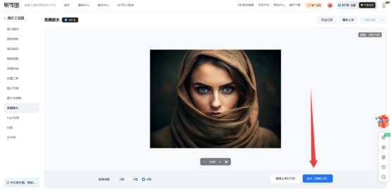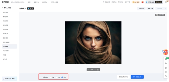 第二步,在图片成功加载到预览区后,您需要在下方的参数调节区选择您预期的放大倍数,目前系统根据用户需求提供了2倍、3倍以及最高4倍的多种方案,在确认所需倍数后点击右下方的放大按钮启动AI算法进行实时处理。