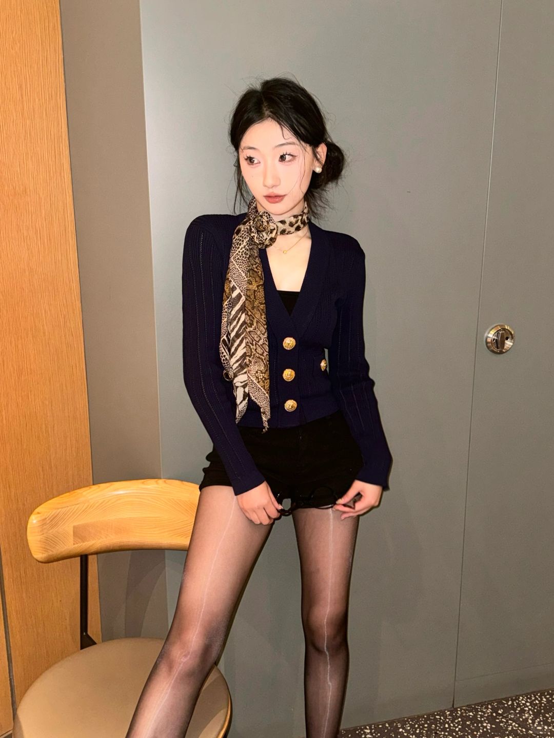没想到丝巾搭针织开衫还挺好看 这谁还分得清我和空姐(有161的空姐吗❓ 豹纹丝巾➕藏青色针织开衫➕黑色牛仔短裤 我称这套为精致女人的优雅套装👩哈哈哈哈哈