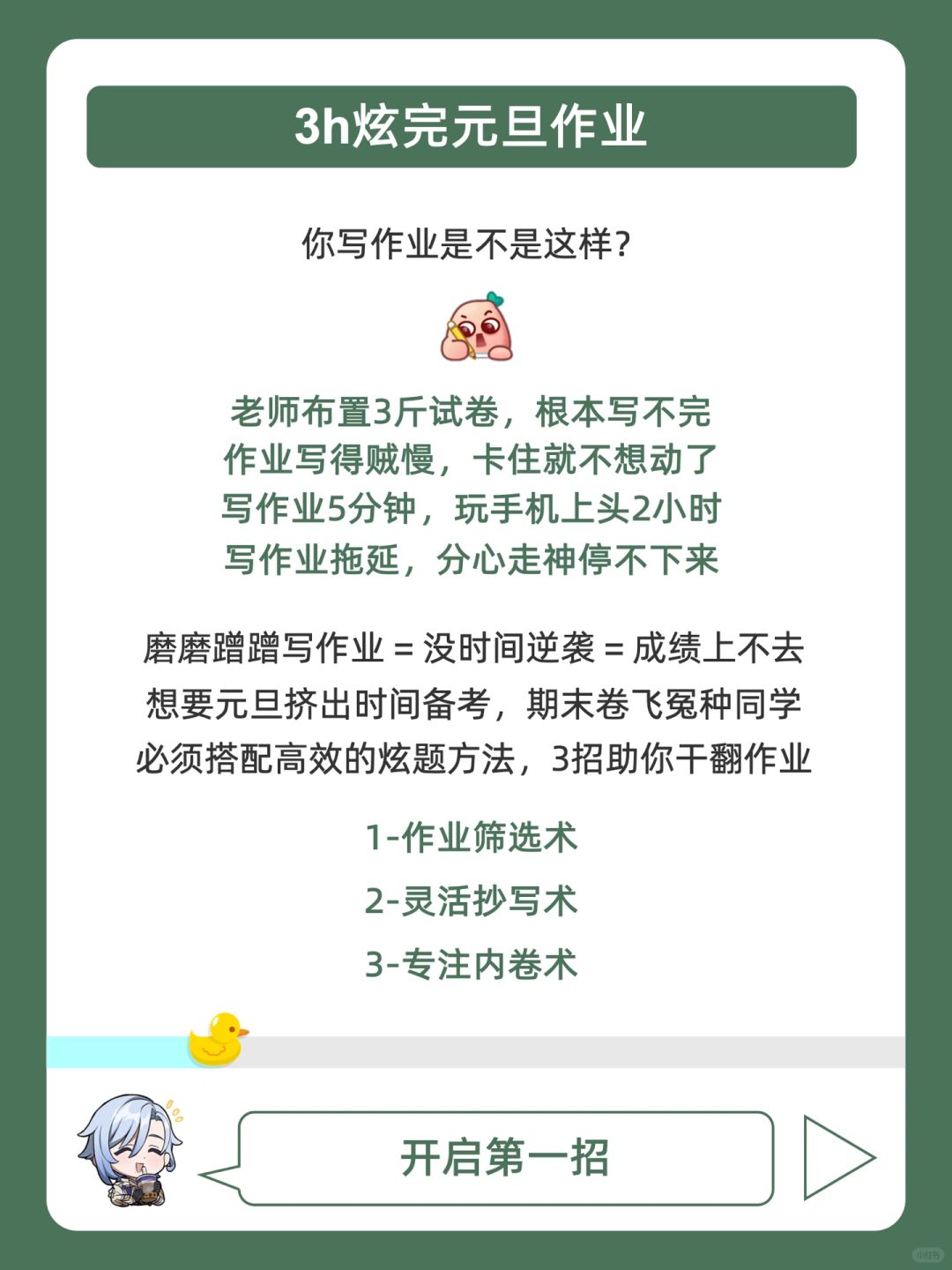 · [赞R]作业摆烂不用怕,鸭鸭带你做学霸❗️ · [哇R]拿下这篇元旦极速炫作业攻略,期末逆袭就在于此!🚀 · 🔥赶紧学起来,写完作业就可以疯狂玩元旦啦~[庆祝R] · ️🐣我是鸭鸭,持续分享更多优质学习方法,陪宝子们快乐学习,驰骋学海!🌊