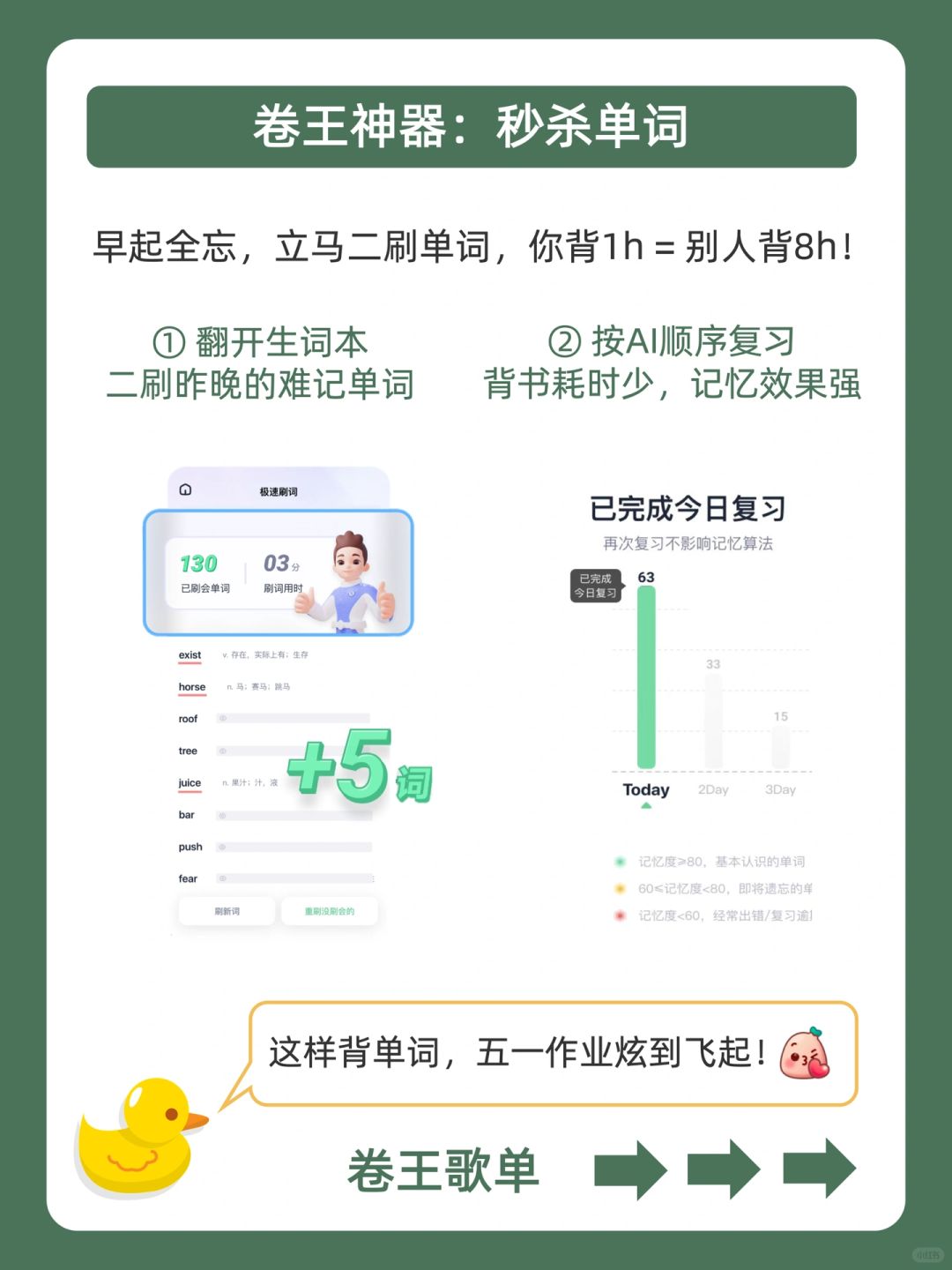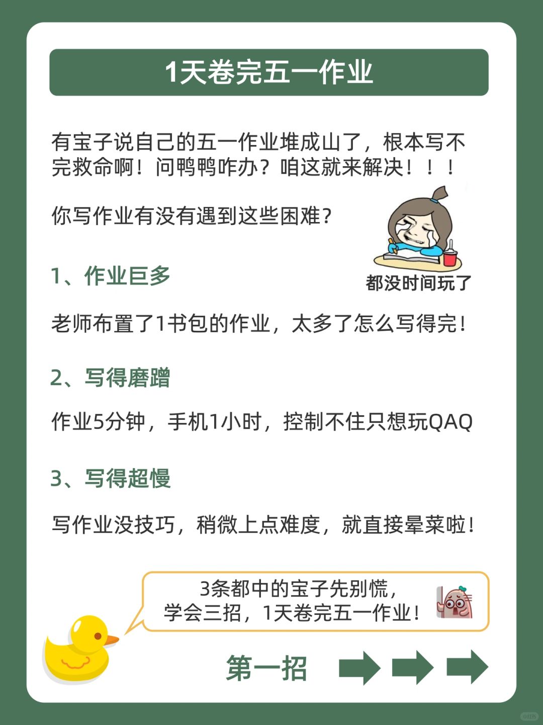 . [赞R]作业摆烂不用怕,鸭鸭带你做学霸❗ . [向右R]太多宝子说五一作业多到写不完,有没有快速炫作业的办法![石化R] . [点赞R]鸭鸭这么宠粉,肯定会想办法帮你们的哇![飞吻R] . [加油R]今天就来分享,1天卷完五一作业,都在上面的图,看完就能用,从此作业无忧,嗨玩五一![派对R] . 🐣我是鸭鸭,持续更新优质学习笔记,陪宝子们疯狂内卷,校园逆袭![赞R]