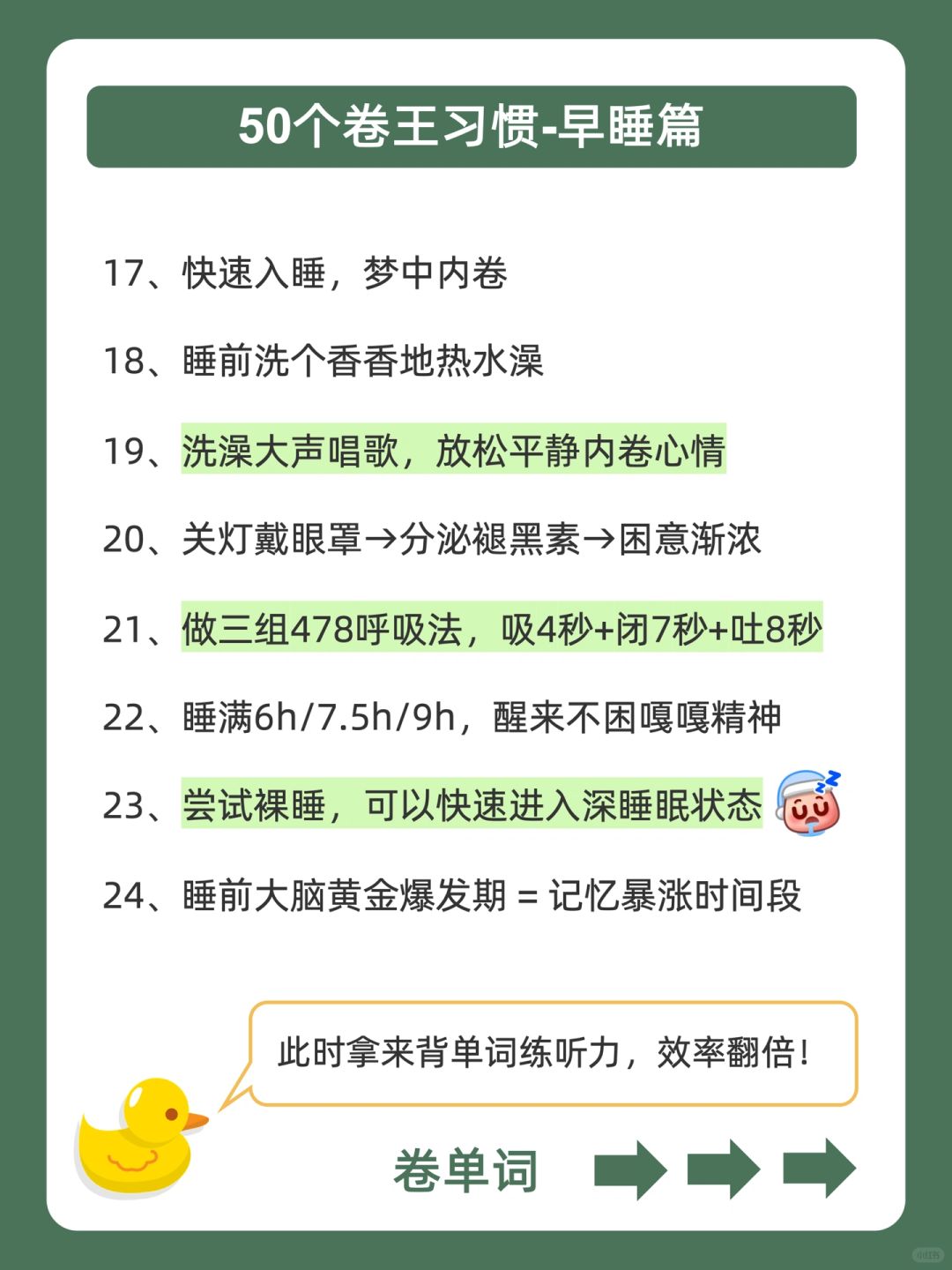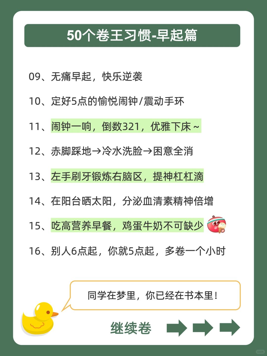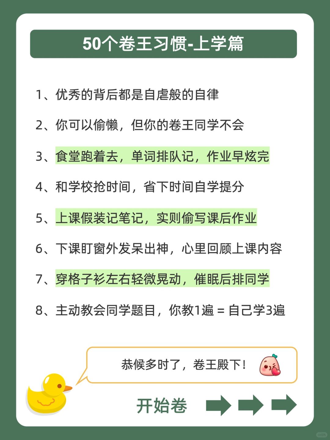 . [赞R]学习摆烂不用怕,鸭鸭带你做学霸! . [向右R]有同学好奇学霸平时都有哪些自律的好习惯[石化R] . [飞吻R]鸭鸭这么宠粉,肯定会全力以赴帮助你们的哇![赞R] . [加油R]今天就来分享,学霸都有的25个日常习惯,都在上面的图,看完就会用!从此偷偷内卷,自律逆袭![赞R] . ️🐣我是鸭鸭,持续更新优质学习方法,陪宝子们快乐学习,驰骋学海!🌊