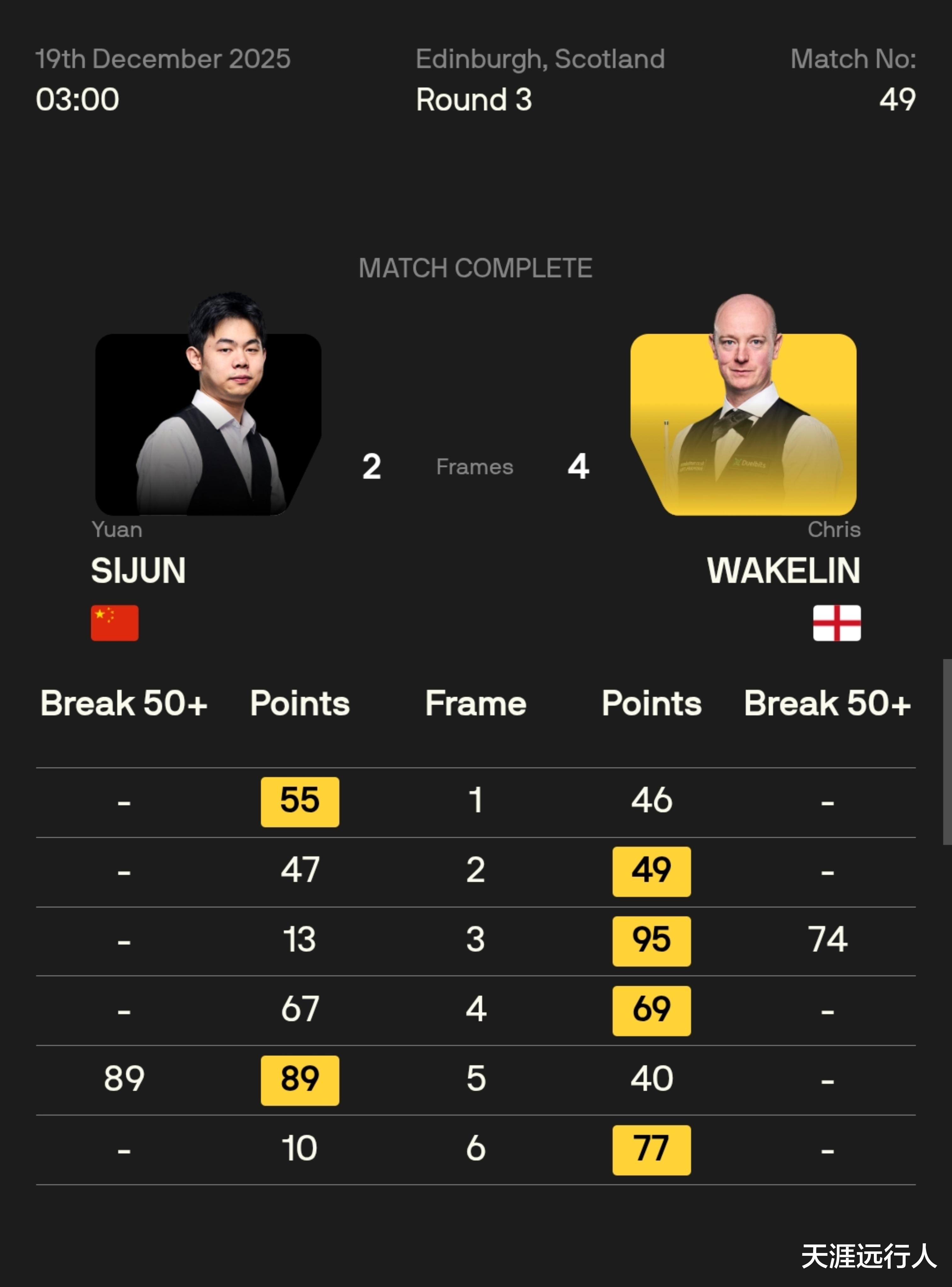双方职业生涯曾交手一次,2023北爱尔兰公开赛1/4赛,韦克林5-2胜出。本场比赛,缠斗中袁思俊清至黑球先下一城,韦克林打出一杆单杆74分,一波三连击先达赛点,小袁回敬单杆89挽救一个赛点,第六局韦克林77-10超分,锁定比赛。