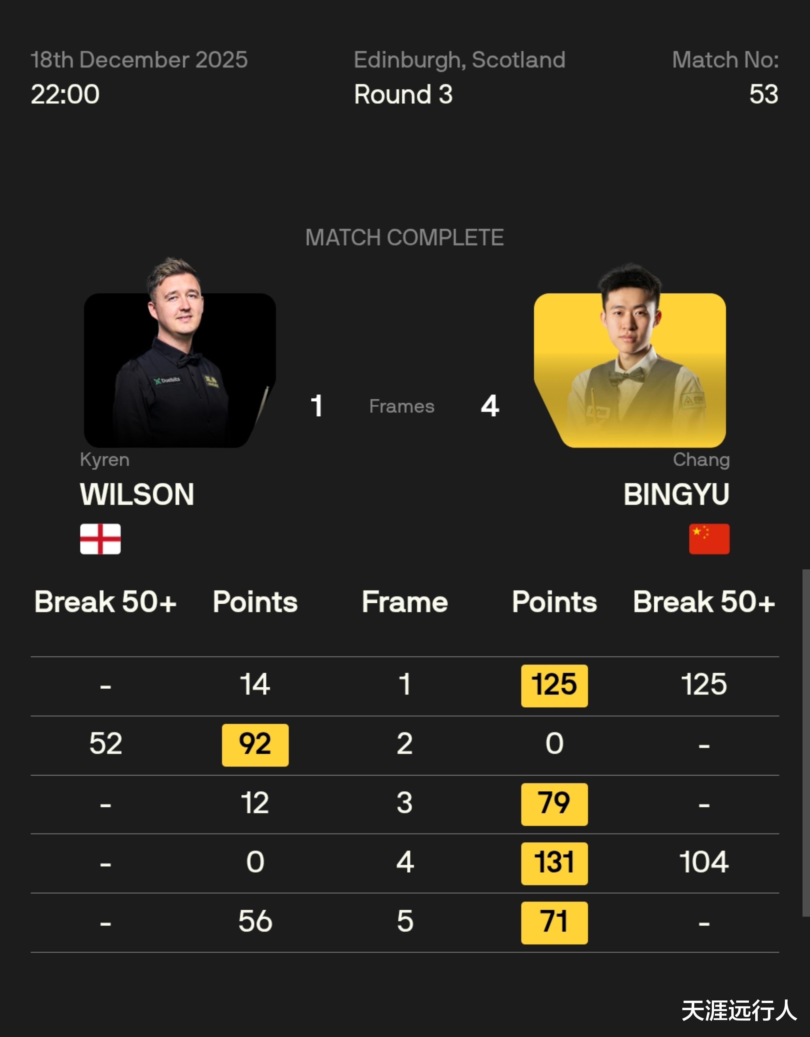这是小将常冰玉首次闯到囧哥帐前,常冰玉轰出125分破百先声夺人,K威打出单杆52分扳平,常冰玉打出104分本场的第二杆破百,一波三连鞭,以4-1轻取世界第二凯伦·威尔逊,强势晋级八强,算上资格赛常冰玉本站已轰出七杆破百。