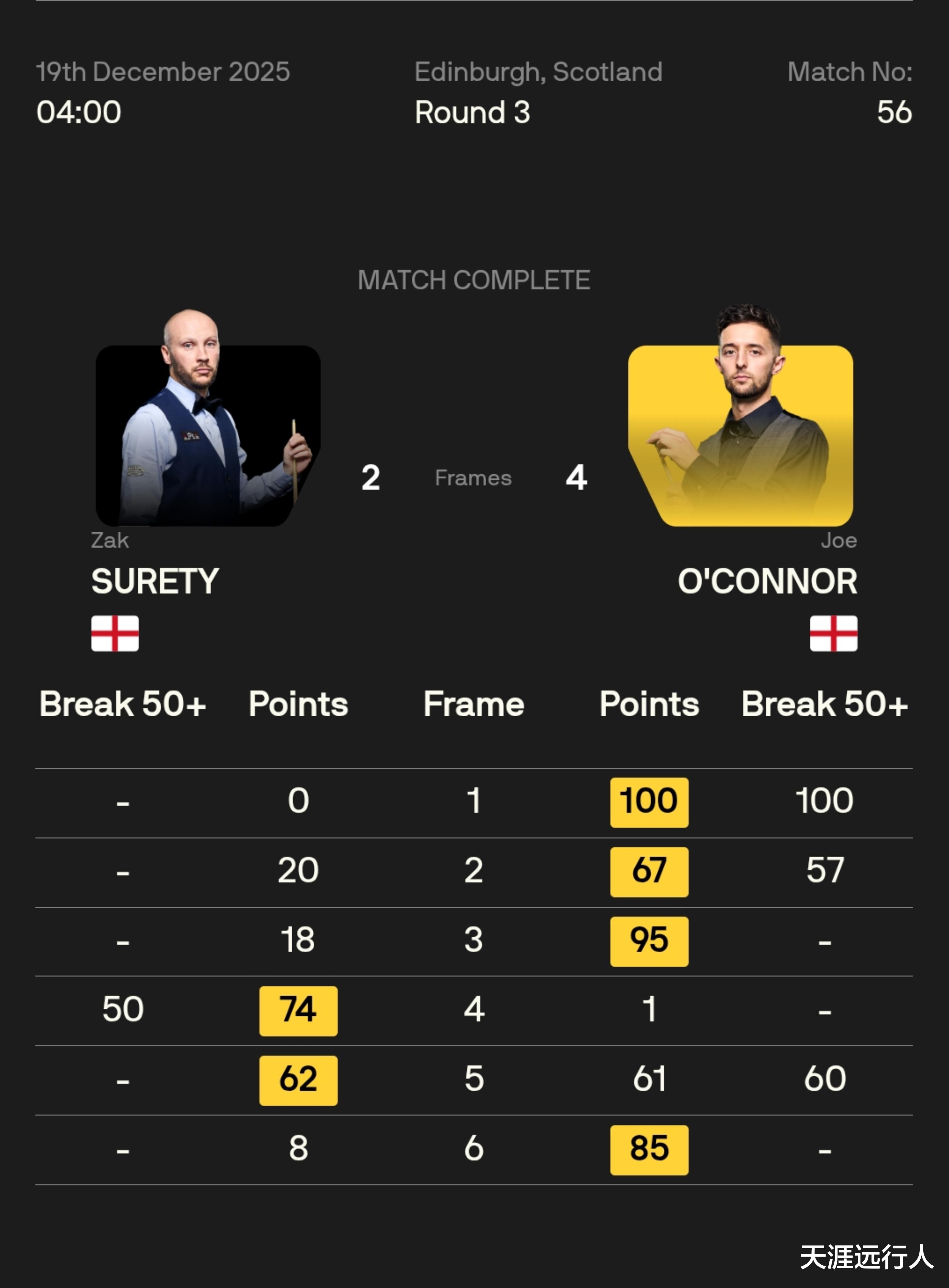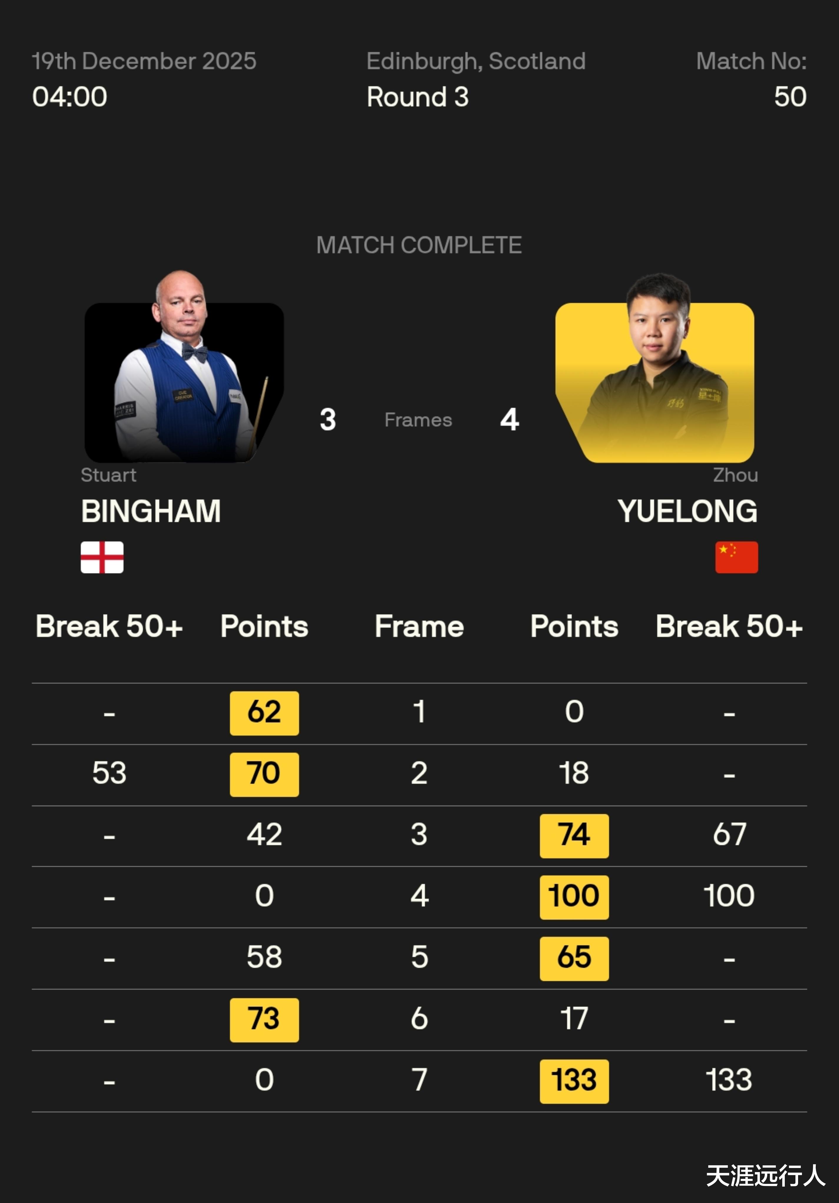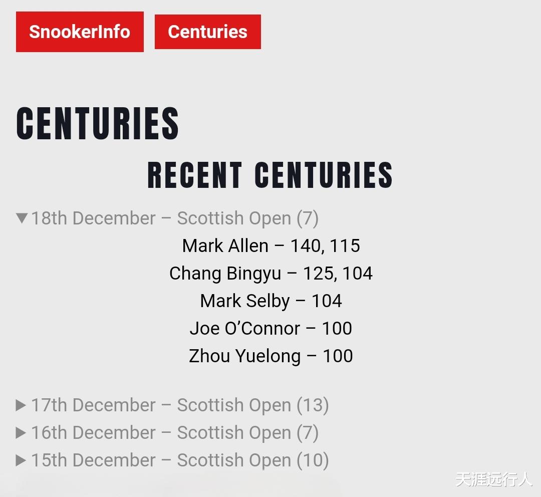 这个比赛日打出八杆单杆破百,本届苏格兰公开赛,已完成56杆。常冰玉、周跃龙各轰两杆,常冰玉本站已经打出7杆单杆破百。