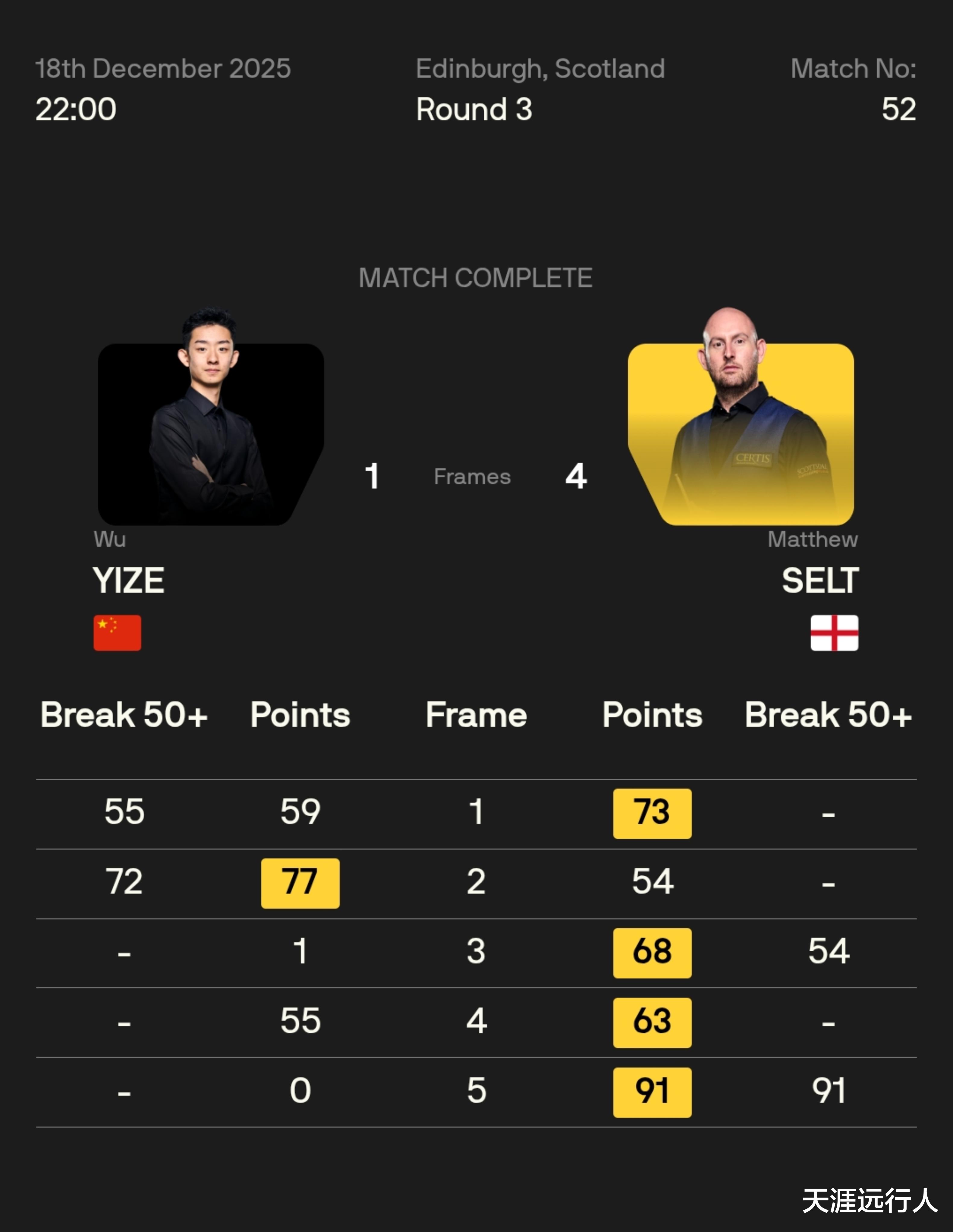 两人之间的遭遇战,吴宜泽前两局打出单杆55、72,可惜首局遭斯二代塞尔特逆转单局,吴宜泽浑似突然掉了线,第四局再遭逆袭,马修·塞尔特打出单杆54、91分,一波三连鞭卷走了胜利,以4-1力压吴宜泽,晋级八强。