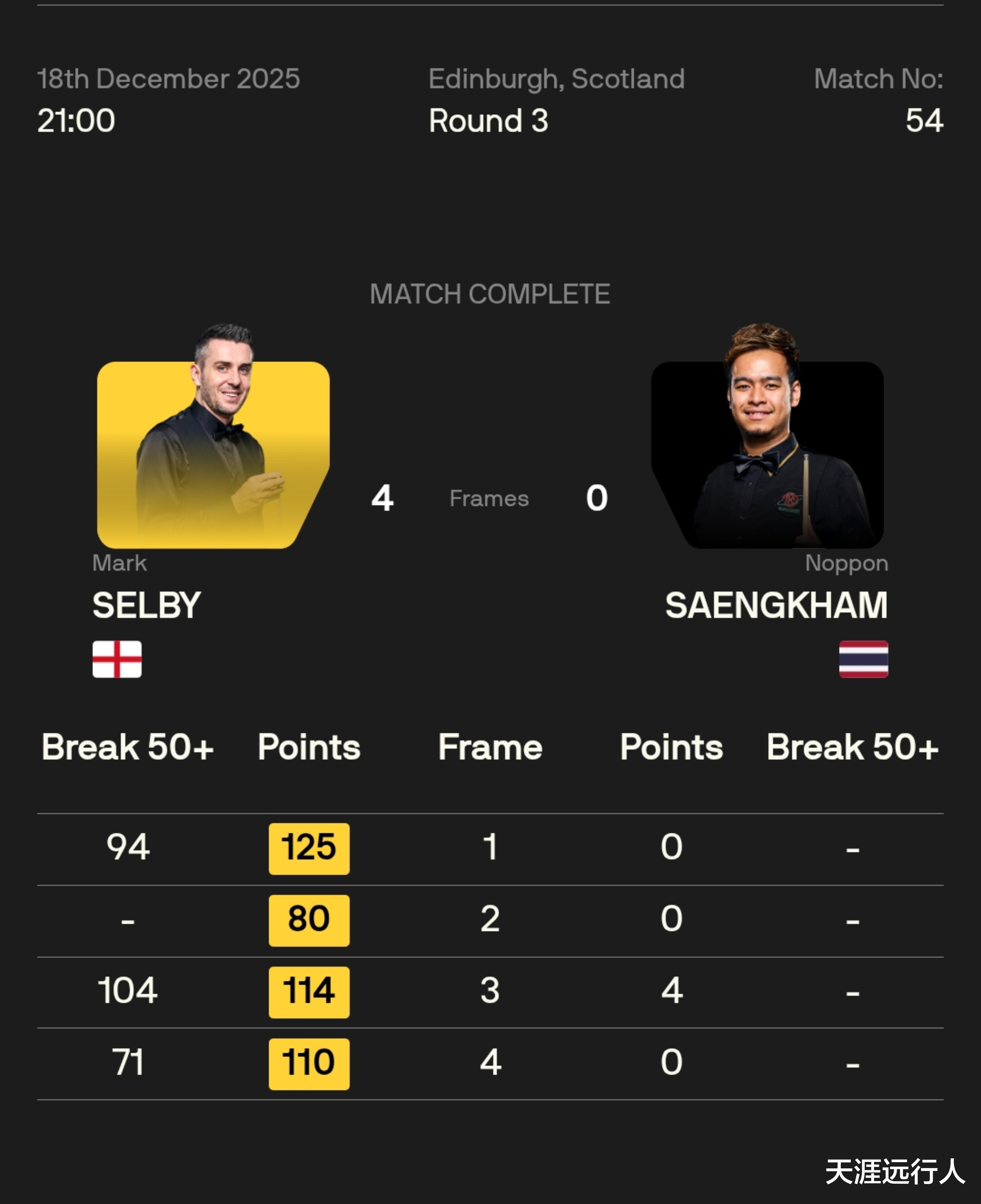 双方此前曾有过14次交手,塞大师11胜3负占据压倒性的优势,不过最近三年的三次对战,桑卡姆赢下两场。本场比赛,马克·塞尔比延续近一段时间的出色表现,打出单杆94、104、71分,其中第三局冲击147打丢了第14颗红球,有些可惜,最终以4-0横扫诺鹏·桑卡姆,晋级八强,四局中三局零封,桑卡姆一颗球也没有打进,1分的主动得分也没有,仅在第四局靠罚分让桑卡姆拿了4分。