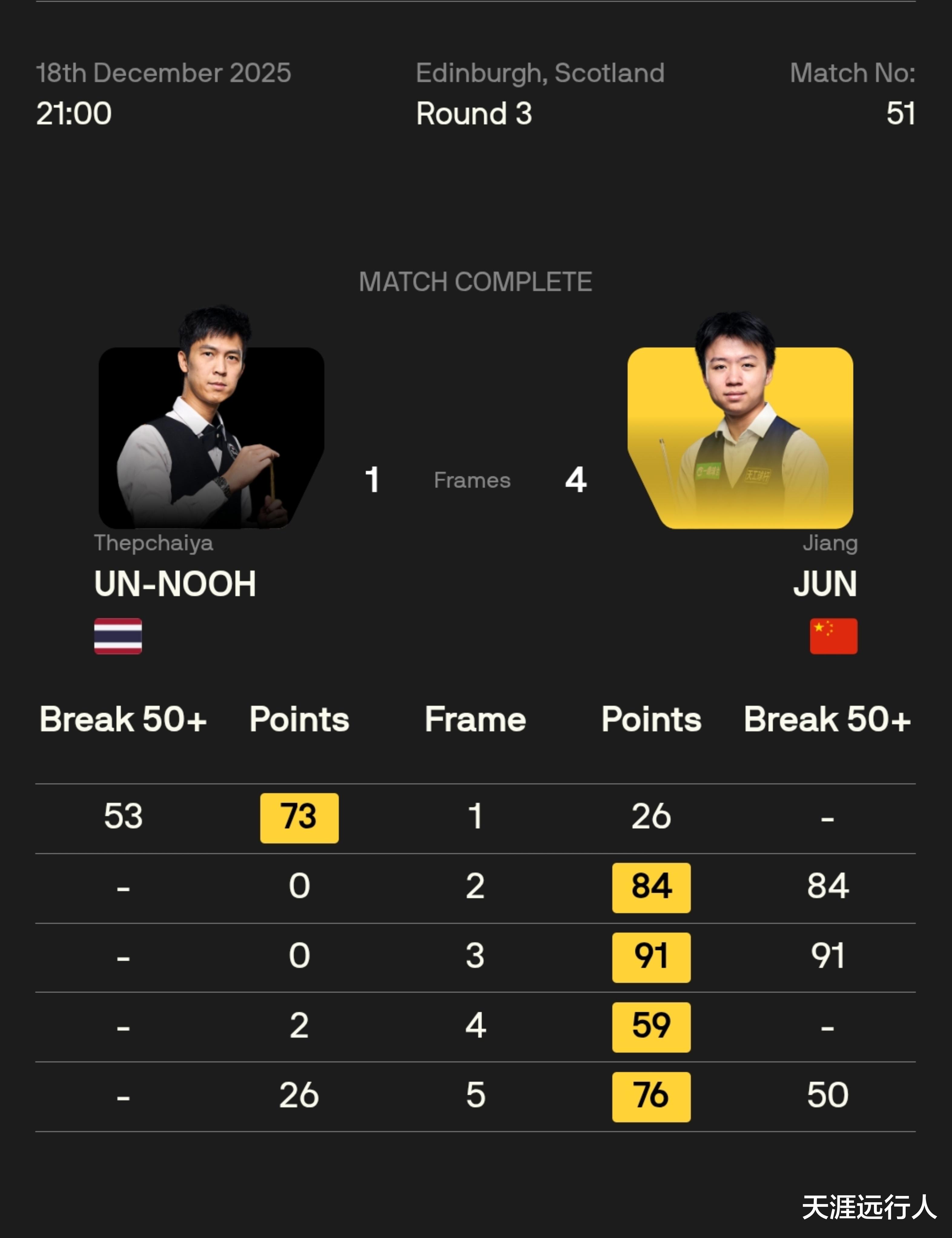 两人此前曾交手一次,就是本赛季的西安大奖赛,泰国快枪手拿下比赛。本场开杆,塔猜亚·乌努打出单杆53分拿下首局,江俊接管比赛,接连打出84、91、50分连胜四局,继上一轮对阵土豆哥,再祭四连鞭,以4-1战胜塔猜亚,首进排名赛八强。