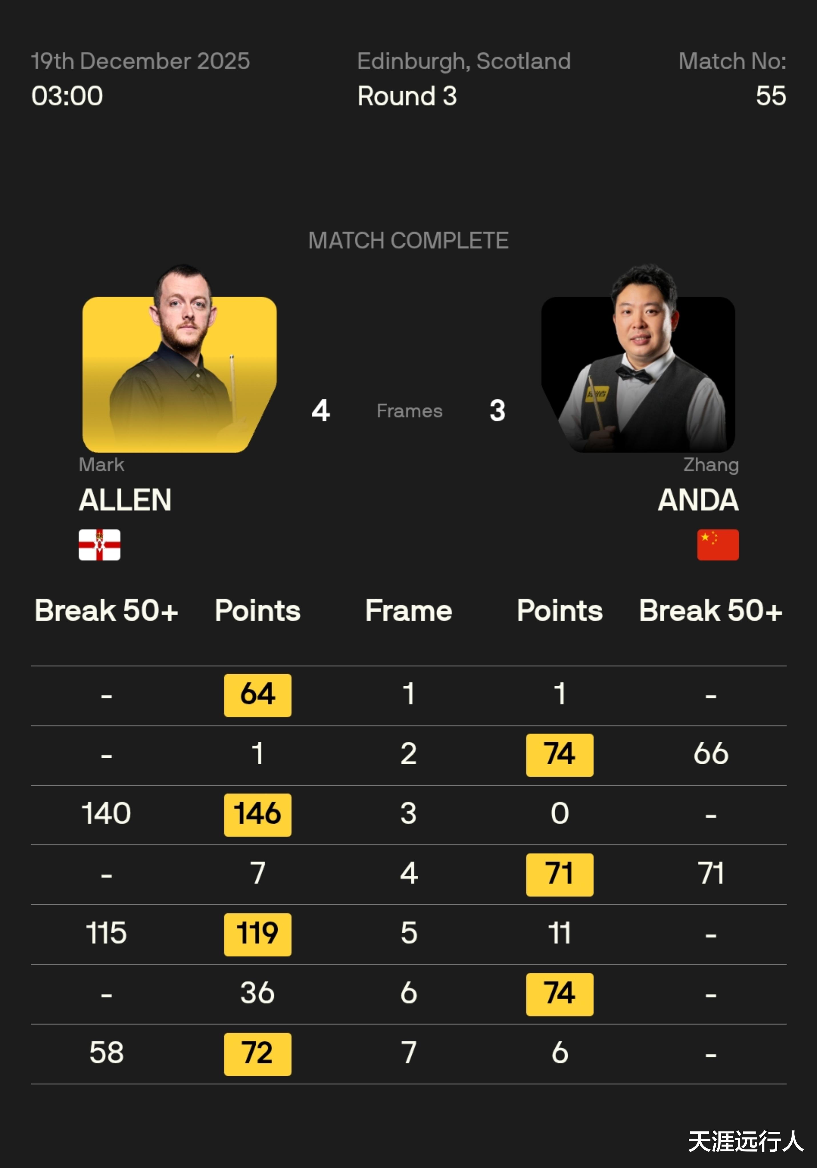 双方职业生涯曾有过4次交手,达仔仅在2024世界大奖赛赢下一场,本场比赛,马克·艾伦打出两杆破百、一杆单杆58,张安达打出两杆60+,艾伦先拔头筹,两人梅花间竹、你来我往,最终艾伦4-3走到终点,晋级8强。