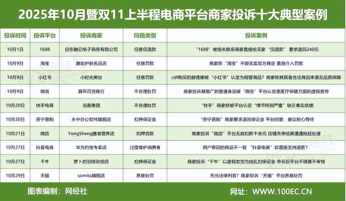 在此背景下,11月6日,依据网络消费纠纷调解平台“电诉宝”商家投诉通道10月受理的全国电商平台大量商家投诉案例,网经社电子商务研究中心例行发布《2025年10月暨双11上半程电商平台商家投诉数据报告》。报告涉及了综合电商、直播电商、生活服务电商、电商服务商等领域,并公布了10月暨双11上半程电商平台商家投诉数据及十大典型案例,通过这些投诉案例可窥见当前电商平台商家困境。