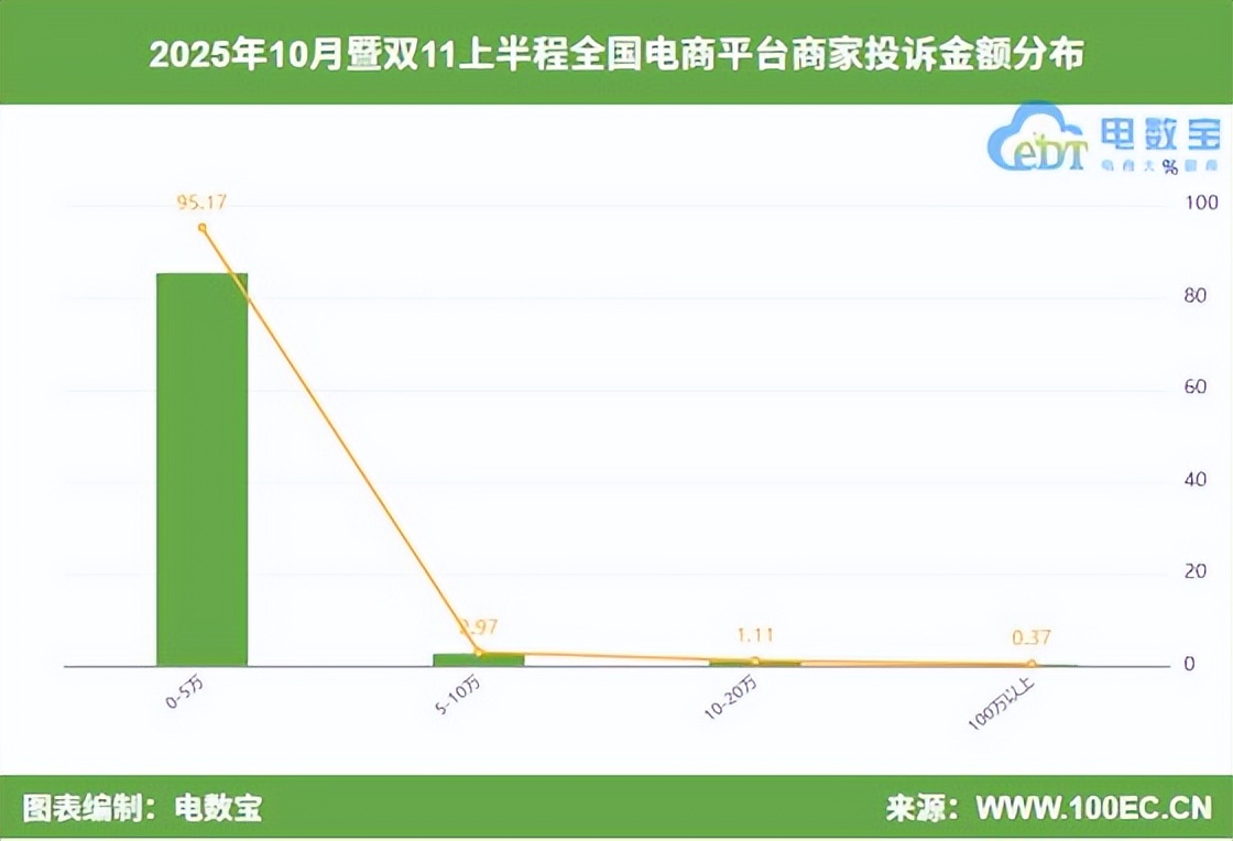 据“电诉宝”显示,10月暨双11上半程商家投诉金额分布主要集中在0-5万(95.17%)、5-10万(2.97%)、10-20万(1.11%)、100万以上(0.37%)。
