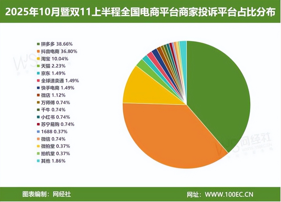 据“电诉宝”显示,10月暨双11上半程电商平台投诉占比依次为:拼多多(38.66%)、抖音电商(36.80%)、淘宝(10.04%)、天猫(2.23%)、京东(1.49%)、全球速卖通(1.49%)、快手电商(1.49%)、微店(1.12%)、万师傅(0.74%)、千牛(0.74%)、小红书(0.74%)、苏宁易购(0.74%)、1688(0.37%)、微信(0.74%)、微拍堂(0.37%)、拍机堂(0.37%)、其他(1.86%)。