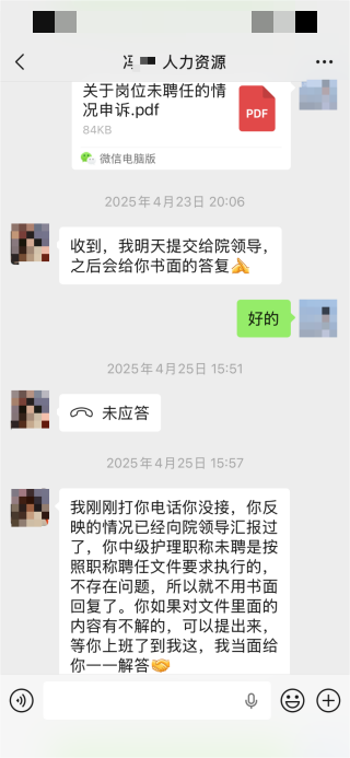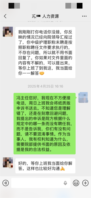 2025年4月21日医院职称结果公示,张女士未获中级职称聘任。她随即展开权益维护:4月23日提交电子版申诉,4月27日递交纸质版申诉并要求医院提供书面拒聘理由,遭院方直接拒绝。当她通过12345平台、县信访单位反映该诉求时,不仅未获解决,反而遭遇医院领导向其部门主任施压,甚至被谈话恐吓。