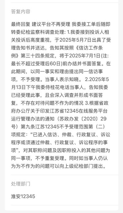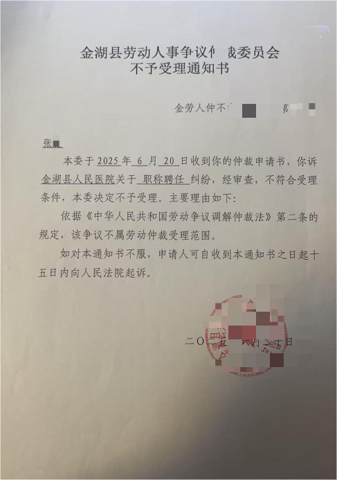 权益维护路上,司法救济渠道同样受阻。2025年6月20日,金湖县劳动人事争议仲裁委员会以争议不属受理范围为由,出具不予受理通知书;9月20日,金湖县法院依据相关司法解释,认定职称争议属单位内部人事管理范畴,不属于民事诉讼受案范围,裁定驳回张女士的起诉。期间,张女士曾于11月在淮安市行风热线金湖专场现场反映问题,县长承诺由司法单位解读文件,后续司法单位组织了当事人、医院、卫健单位三方会谈,却在表示"一周内再联系"后彻底失联。