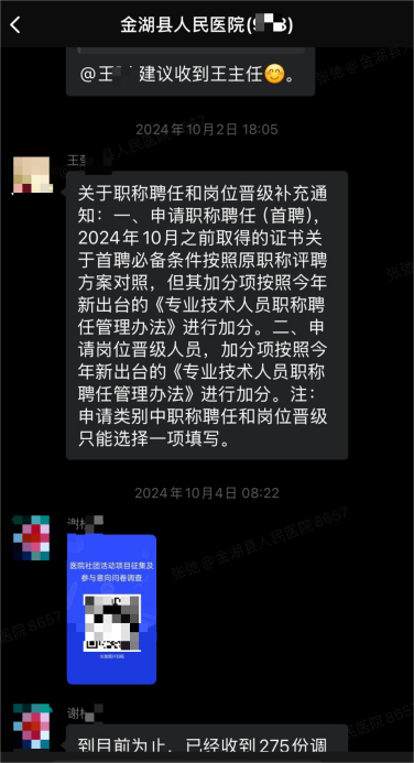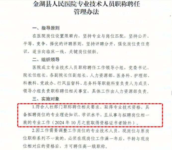 2014年5月,张女士入职金湖县人民医院,先从事护理工作,2017年取得护理学初级(师)证书并于2018年获聘初级护师。2021年2月转岗至科教科任行政干事,2024年4月通过国家统一考试取得护理学中级资格证书,这一时间点,恰好落在医院后续文件的“例外清单”中。2024年10月1日,医院发布《专业技术人员职称聘任管理办法》,明确实施对象需“从事与拟聘岗位相一致的专业工作”,但特意标注“2024年10月之前取得资格证书者除外”;企业微信群内人力资源部门通知更明确,新方案遵循“老人老办法,新人新办法”,此前取得证书者按原方案执行。