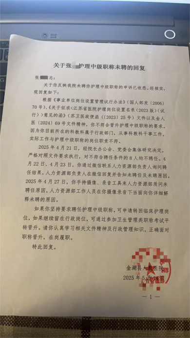 曾获上海市相关疫情防控表彰的江苏淮安金湖县人民医院护士张女士,手持2024年4月取得的护理学中级资格证书,完全契合医院《专业技术人员职称聘任管理办法》中“2024年10月前取证者除外”的“老人老办法”明确规定,却因“岗位与职称不匹配”遭金湖县人民医院拒聘;权益维护近一年间,她不仅遭遇医院主要领导的施压恐吓,还陷入多部门相互推诿、司法救济渠道不予受理的三重困境,最终于2026年1月无奈离职,而这场围绕“规则是否被选择性执行”的核心争议,至今仍未得到明确答复。