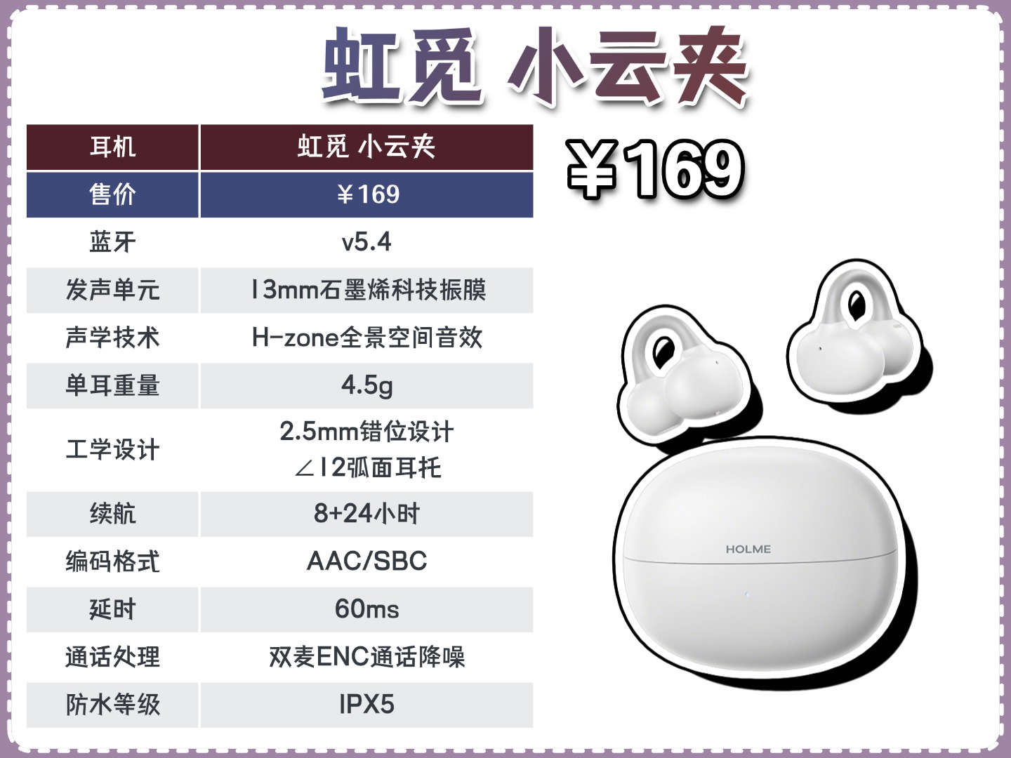 虹觅小云夹采用2.5mm错位设计与12度弧面耳托,佩戴轻盈舒适;13mm石墨烯振膜配合全景空间音效,带来清晰自然的声音表现;防漏音模式在安静环境中使用更安心,配合24小时总续航满足日常需求。整体性价比很突出,没有明显缺点,特别适合预算低的学生党日常使用。