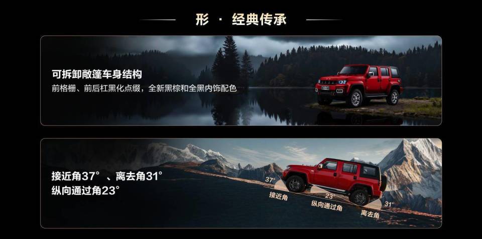标志性的五孔格栅、LED光圈大灯和隧道式尾灯构成了车辆的高辨识度前脸。更为独特的是,这款车采用了同级唯一的可拆卸硬顶与开式车身设计,通过简单的操作就能从硬派越野变身为敞篷车,满足了用户对多元场景的需求。